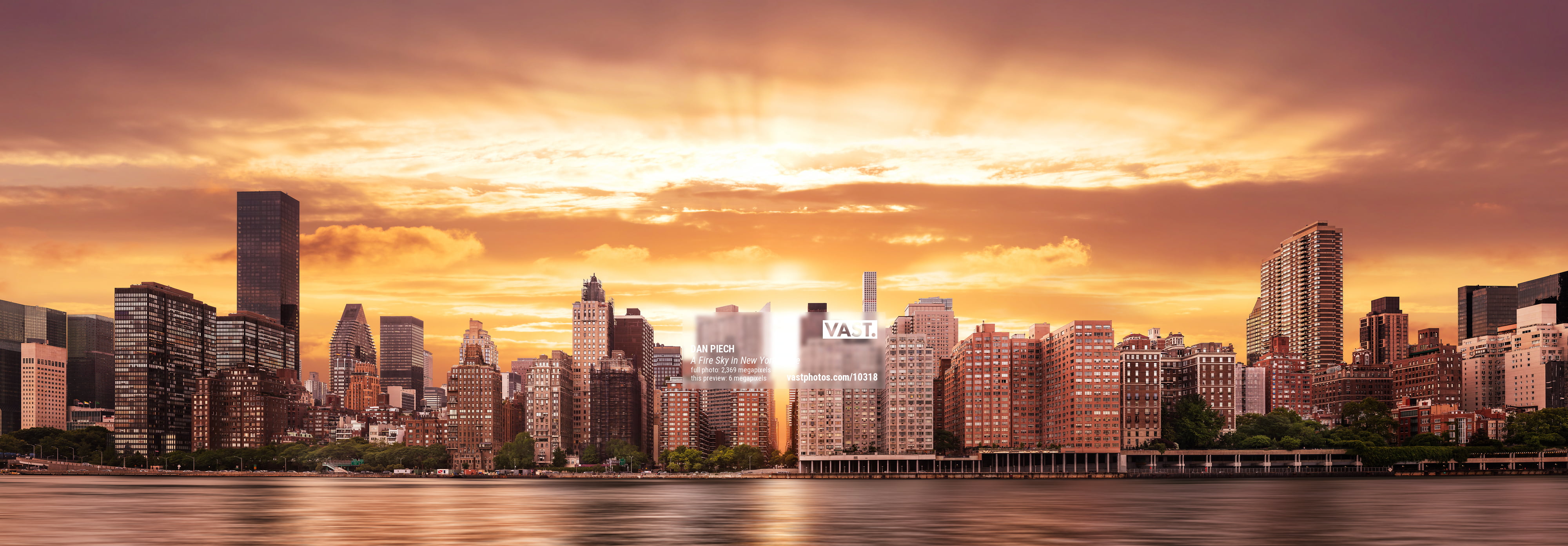 I was about to give up on the shot when I noticed the clouds on the horizon beginning to dissipate. Hoping for the best and never underestimating the importance of getting the correct photographic angle, I climbed over a fence and down an embankment wall into the East River. Standing on a submerged rock, I assembled my tripod and gear amid swells from passing barges and the rising tide. As the sun appeared beneath the cloud banks, New York bore witness to a few stunning moments of beauty. An enormous halo of light streamed up from between the cloud banks, lighting up the sky like a fire.