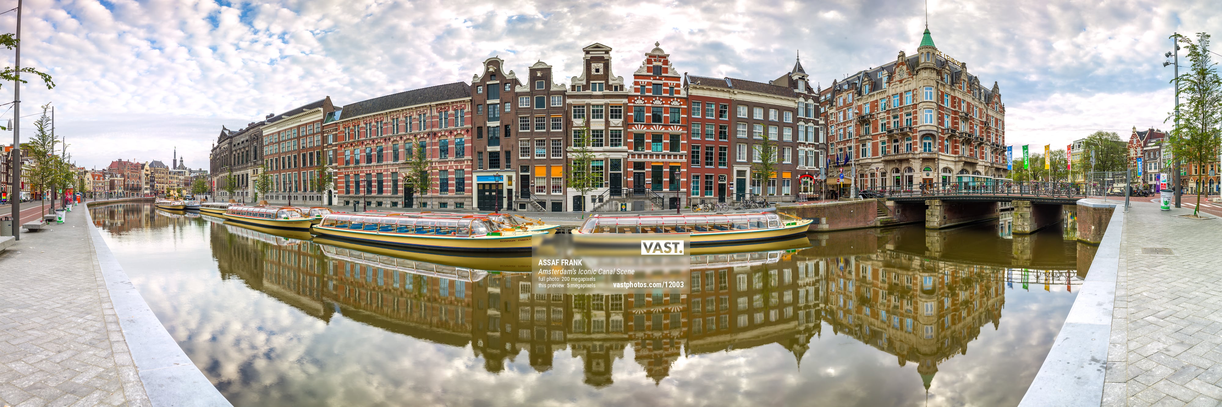 Elegant canal boats are moored along the edge, ready to take visitors on a tour of Amsterdam’s world-famous waterways. The bridge in the background connects the lively streets, showcasing the seamless blend of historic charm and modern city life. The cloudy sky adds texture to the composition, complementing the architectural details and the calm atmosphere.