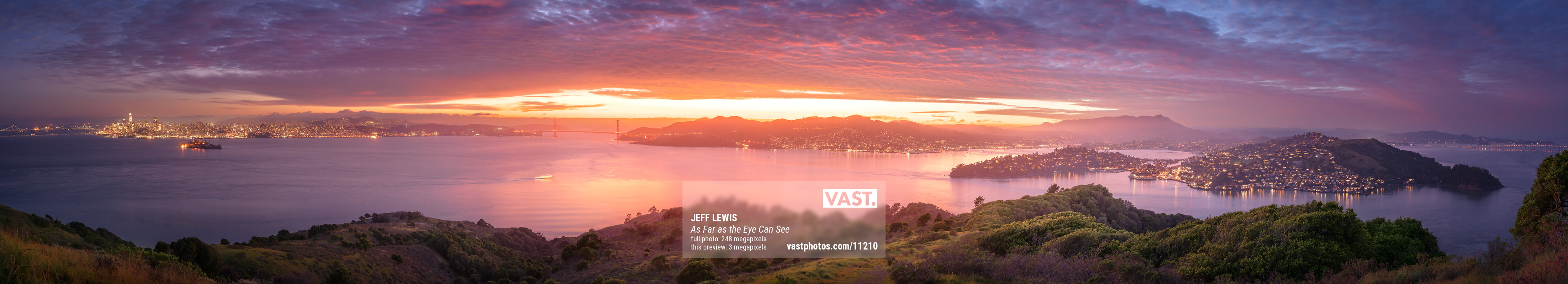 Almost 6 months later, my partner and I boarded the ferry and backpacked into our campsite. Just from our tent window, we enjoyed incredible views spanning from San Francisco to the Golden Gate. On the two nights we stayed on the island, something very special happened. Nature gifted us not just one, but TWO absolutely spectacular sunsets. I was stunned after the first one, and even more stunned after this second one. I knew I had to capture every detail of it, and thankfully I had brought my full setup to take this VAST photo!