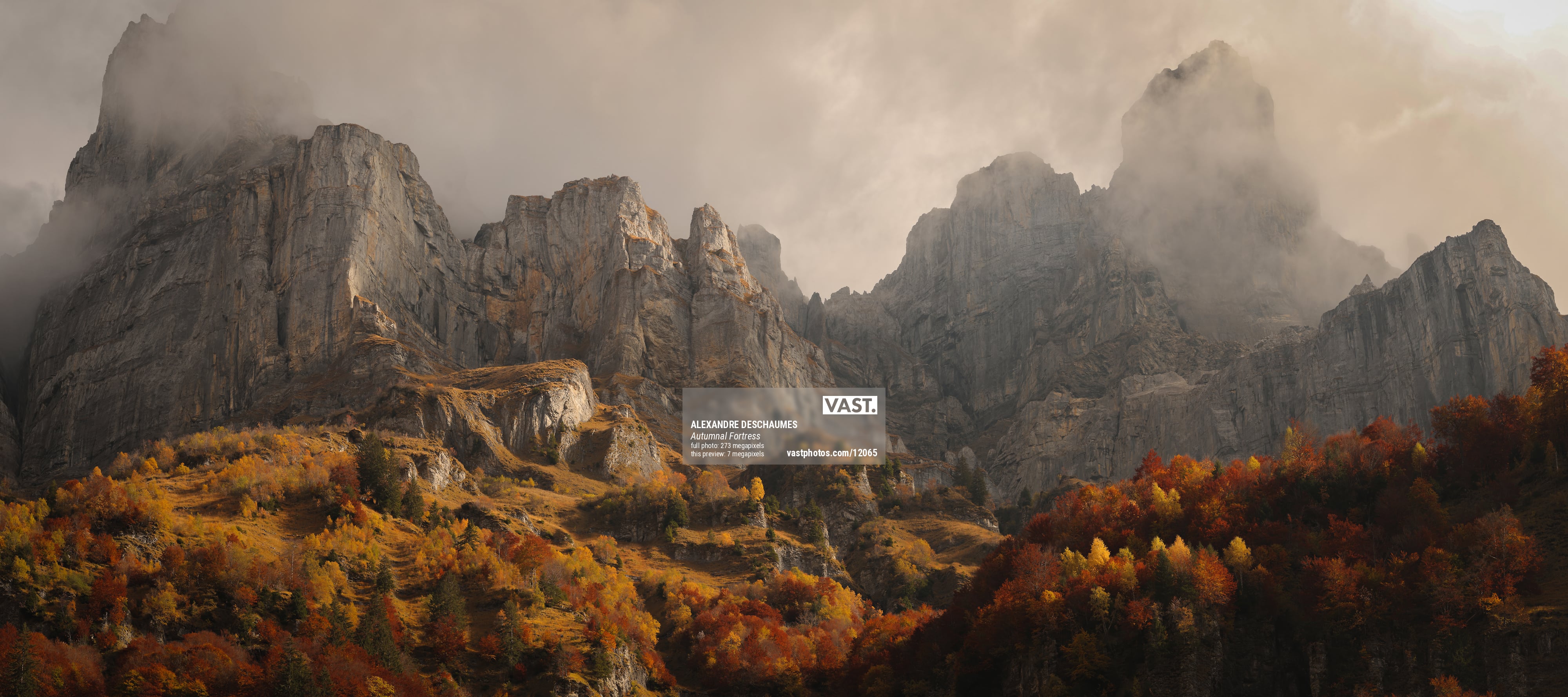 This captivating scene, taken in the Cirque du Fer-à -Cheval, exudes a cinematic atmosphere. The towering cliffs, shrouded in a veil of mist, are illuminated by a soft, diffused light, enhancing the mood of quiet grandeur. Below, the landscape comes alive with the complex hues of autumn—rich reds, golden yellows, and deep oranges blending harmoniously across the terrain.