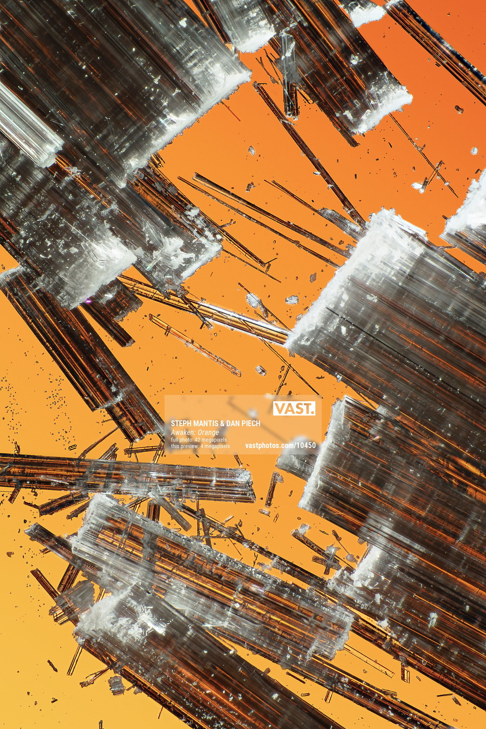 Imbued with the captivating energy that artists Steph Mantis and Dan Piech bring to their work, the Awaken series of VAST photos represents a collaboration of creative and technical mastery. The series explores the artistic beauty of microscopic selenite crystals photographed at extraordinarily high resolutions using specialty equipment and innovative techniques.