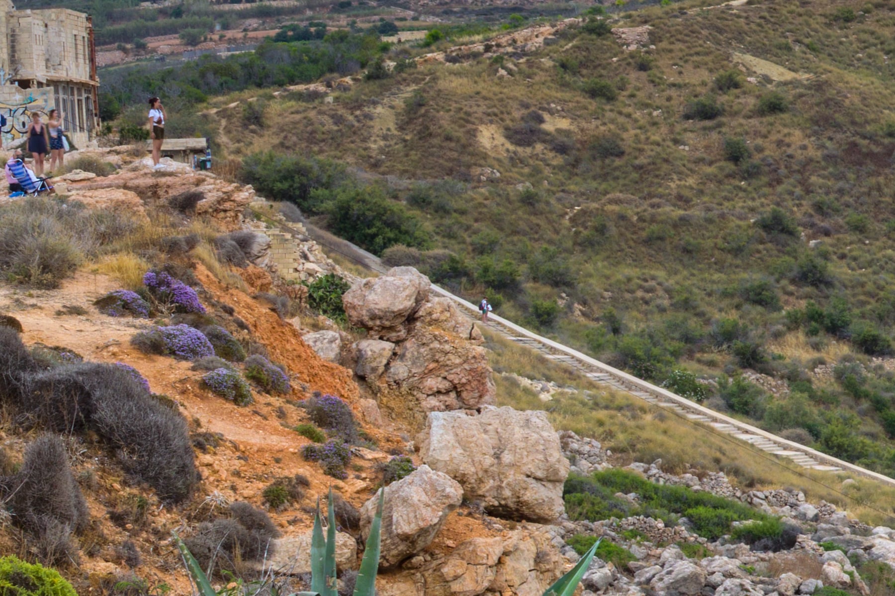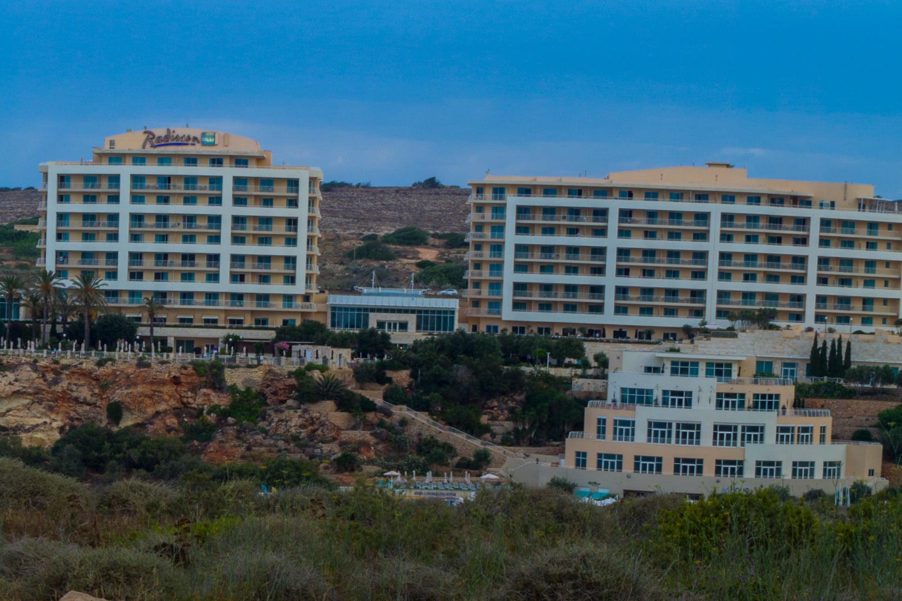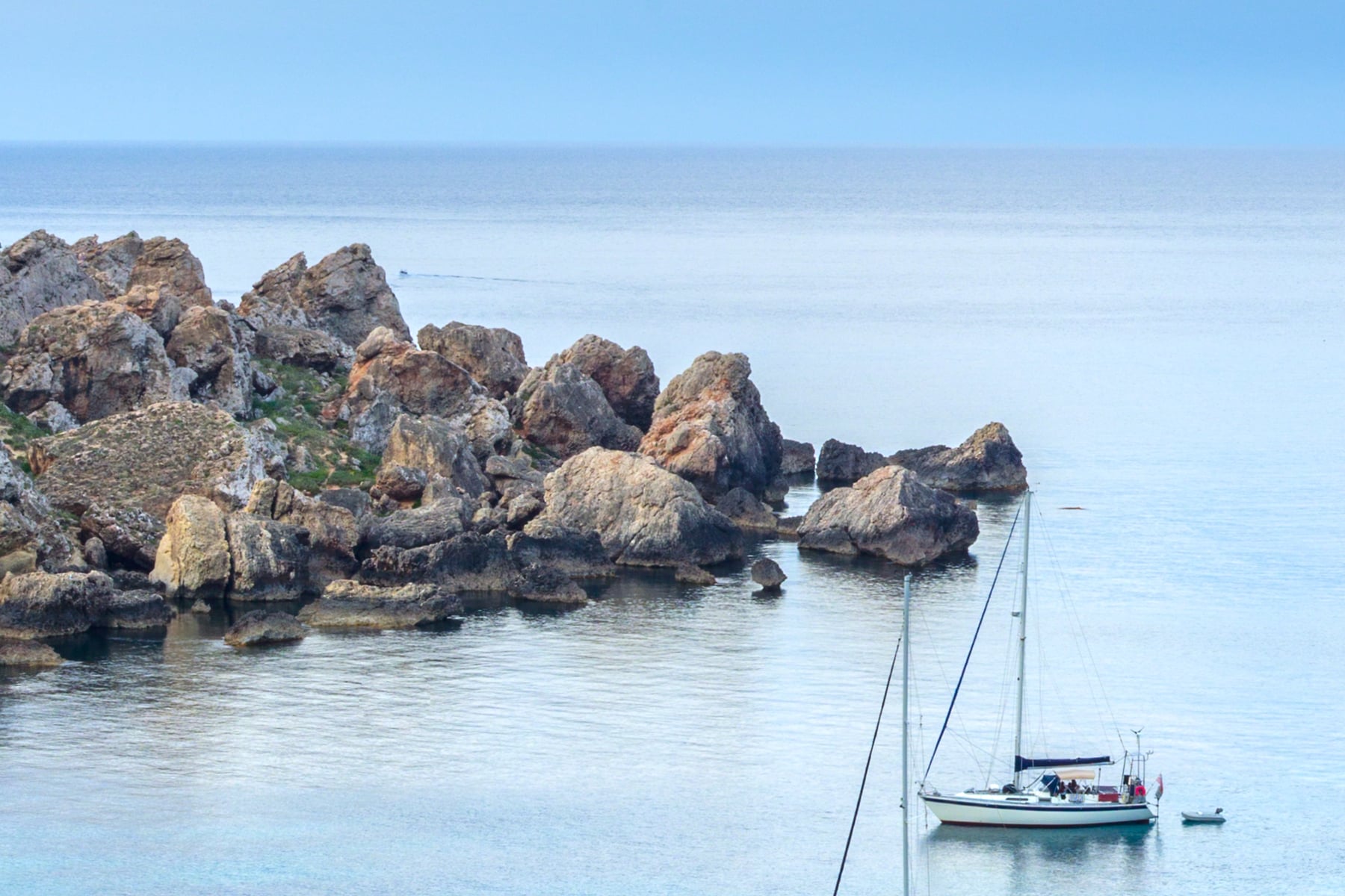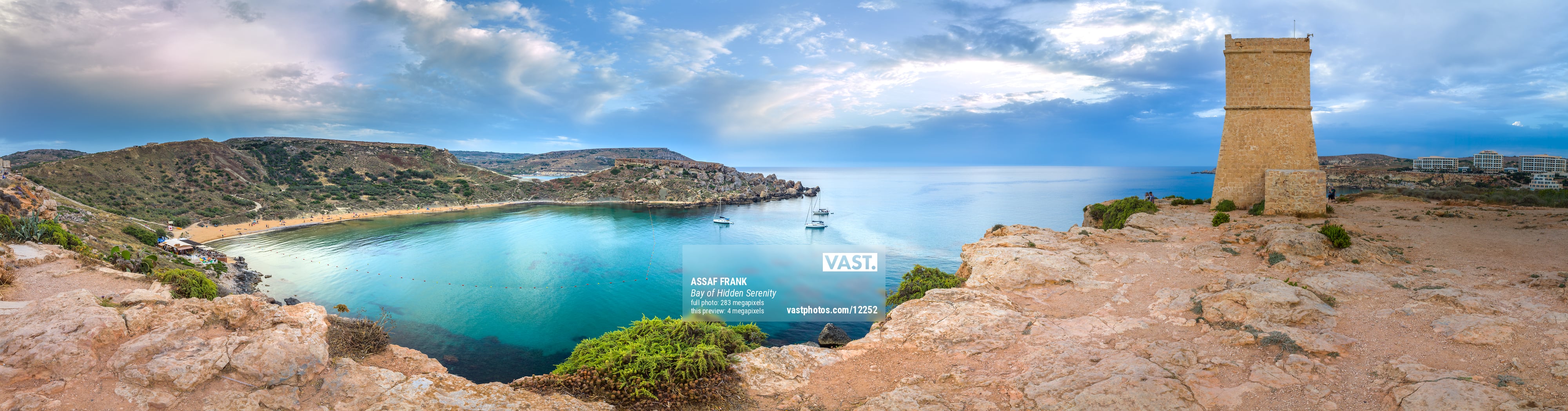 Dominating the right side of the composition is an ancient watchtower, a historical sentinel that adds character and depth to the image. Beyond the tower, modern buildings are subtly integrated into the background, reflecting Malta’s blend of historical charm and contemporary life. The panoramic view invites viewers to explore the natural splendour of the Mediterranean coastline, evoking feelings of adventure, relaxation, and timeless beauty.