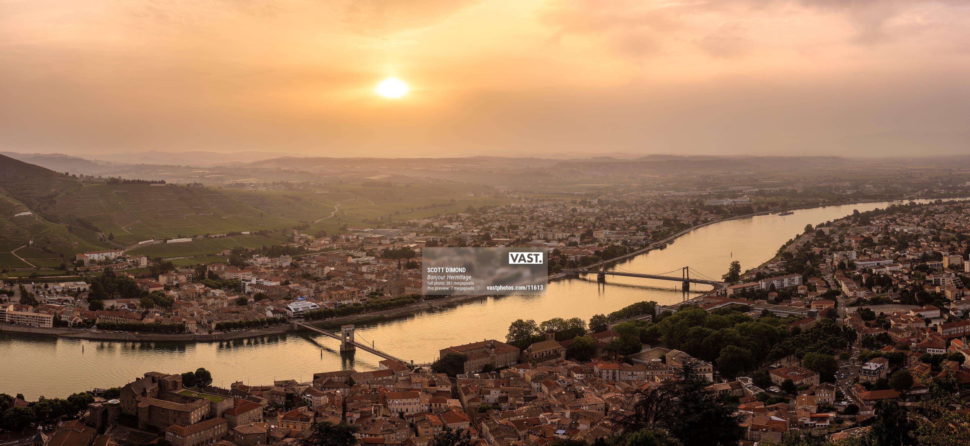 I was staying down right beside the Rhone, so to get up to the viewpoint I started hiking the Sentier des Tours (Tower Trail) at 5 am. Of course, I was hauling the specialized equipment needed to create a VAST ultra-high-resolution image, so my pace was steady but not quick. In the end, I made the journey in about 40 minutes and arrived before sunrise which happened at 5:53 am. This image is created from the second set of images I captured while up above Tournon-sur-Rhône. The first set was a wider view that included more of the Hermitage Hill. However, low clouds blocked the sun at that time. Once the sun rose above the low cloud bank the view captured in the second set of images was spectacular, with all the rooftops of both towns in the foreground and the base of the Hermitage Hill leading off to the left beyond Tain all bathed in an orange glow.