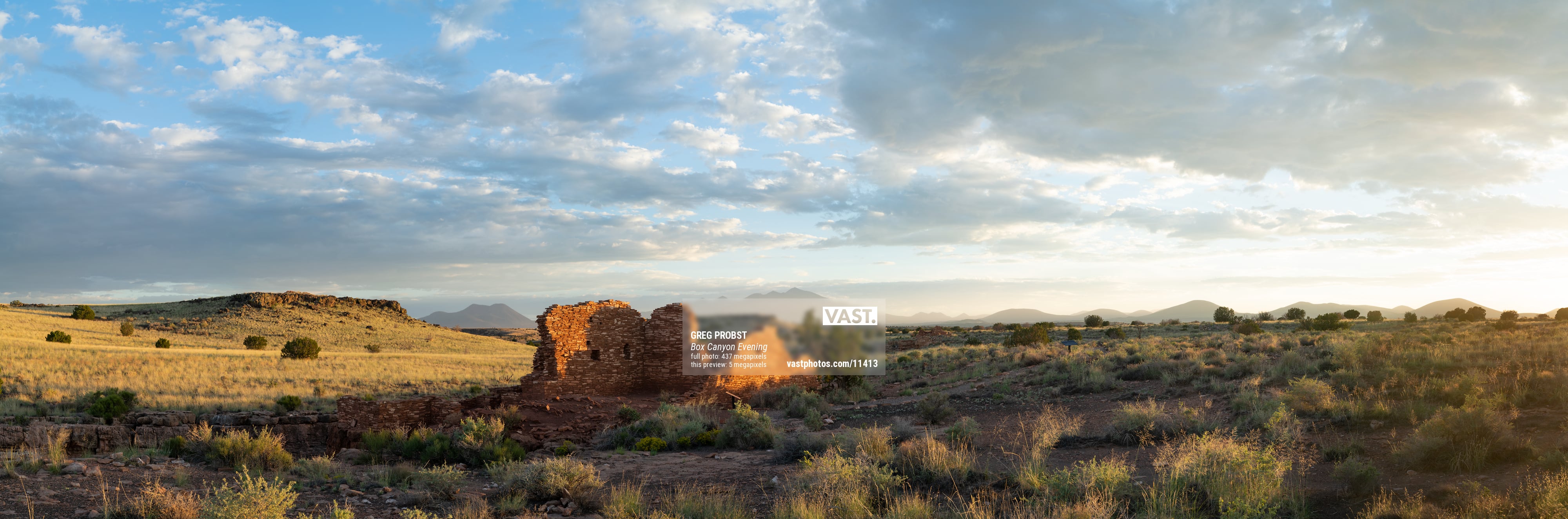 The clouds make this image. The color in this image was created by the evening sun light passing through the moisture of the clouds, the shadows were made by the clouds, I love broken clouds like these in the morning or evening. In the distance the San Francisco Peaks can be seen just above the ruin/pueblo.