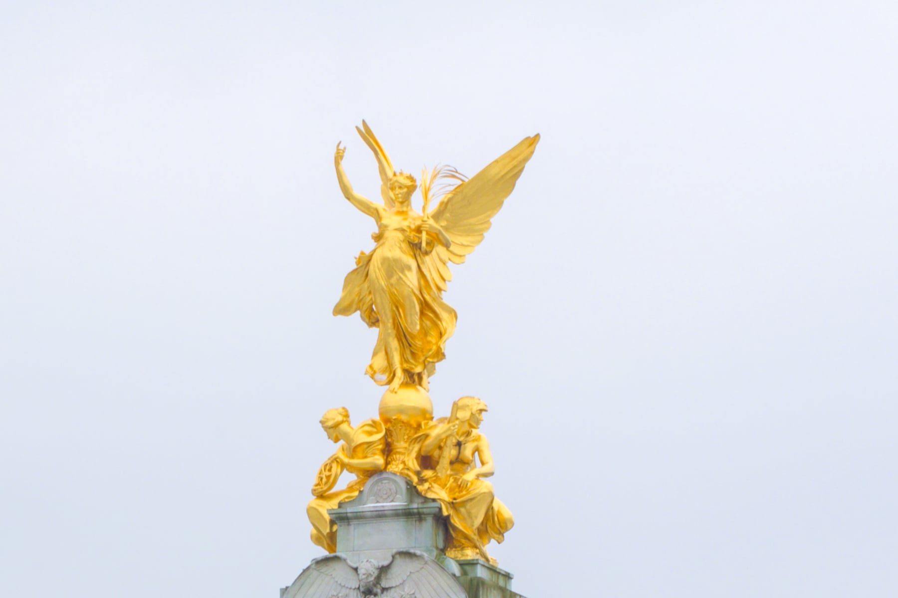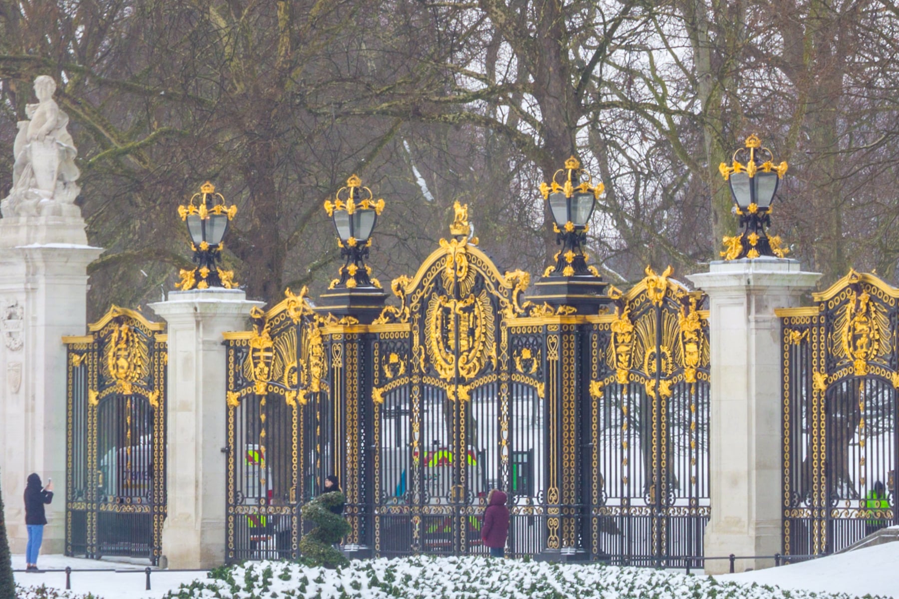 This enchanting panoramic photograph captures Buckingham Palace in the heart of London, adorned by a serene winter blanket of snow. The image beautifully showcases the grandeur of the royal residence, with its neoclassical architecture standing proudly against the soft, overcast sky. In the foreground, the Victoria Memorial, gilded in gold, adds a striking contrast to the muted tones of the snowy landscape. The normally bustling area appears calm and peaceful, offering a rare and magical glimpse of the palace grounds transformed into a winter wonderland.