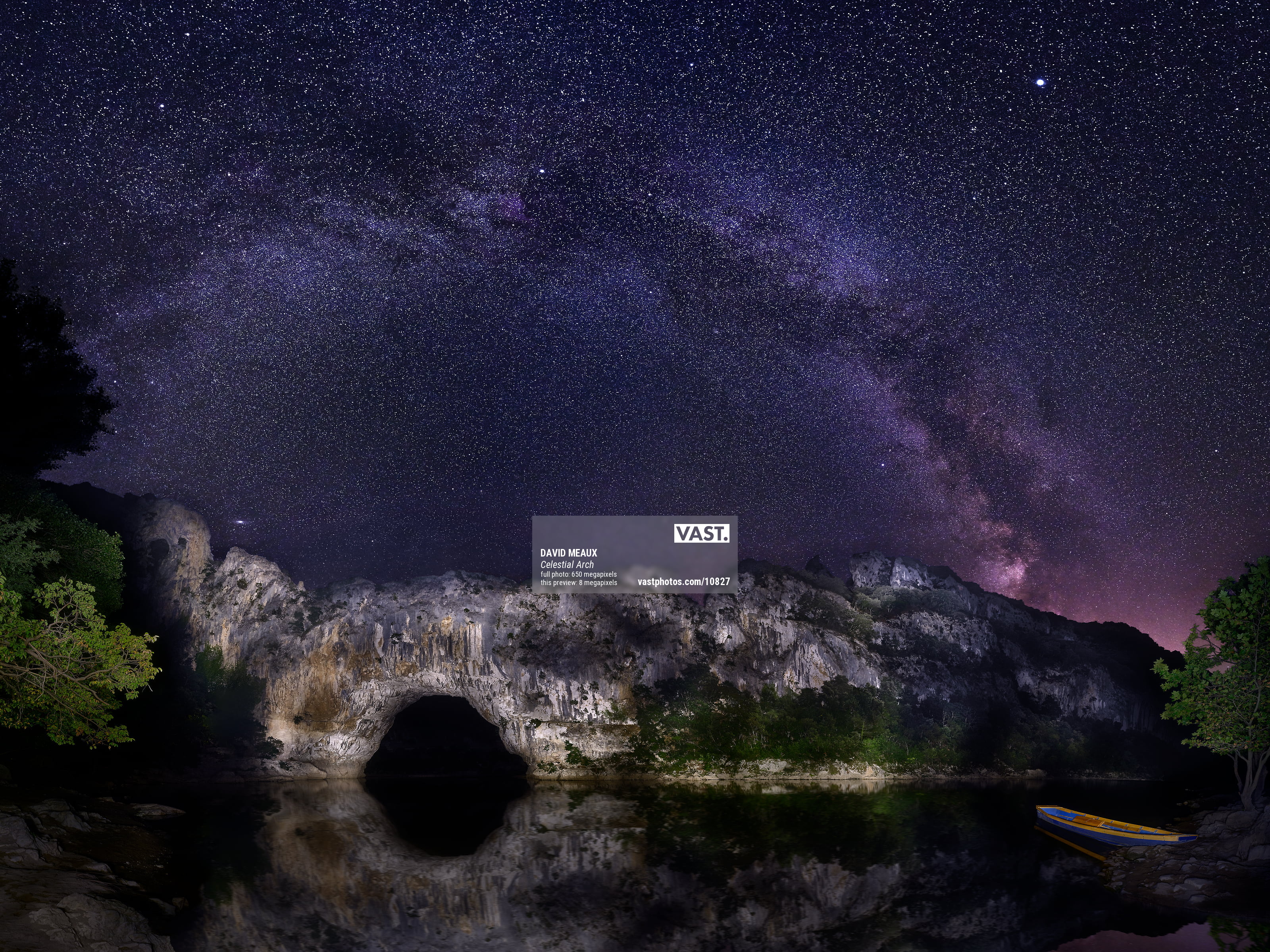 I wanted to capture the arch of the Milky Way with a natural land bridge so that they would exemplify the symmetry that can be found throughout nature. My search for the right location and the right time of year led me to Pont d’Arc in the Ardèche department of France on a summer night. Geologists believe the arch was formed as the Ardèche River broke through a narrow escarpment. This 60-meter (196 feet) tall natural bridge is the gateway to the majestic Ardèche Canyon, which is about 30 km (18 miles) long. Once a passage to cross the river, the site is currently one of France’s most famous natural heritage sites.