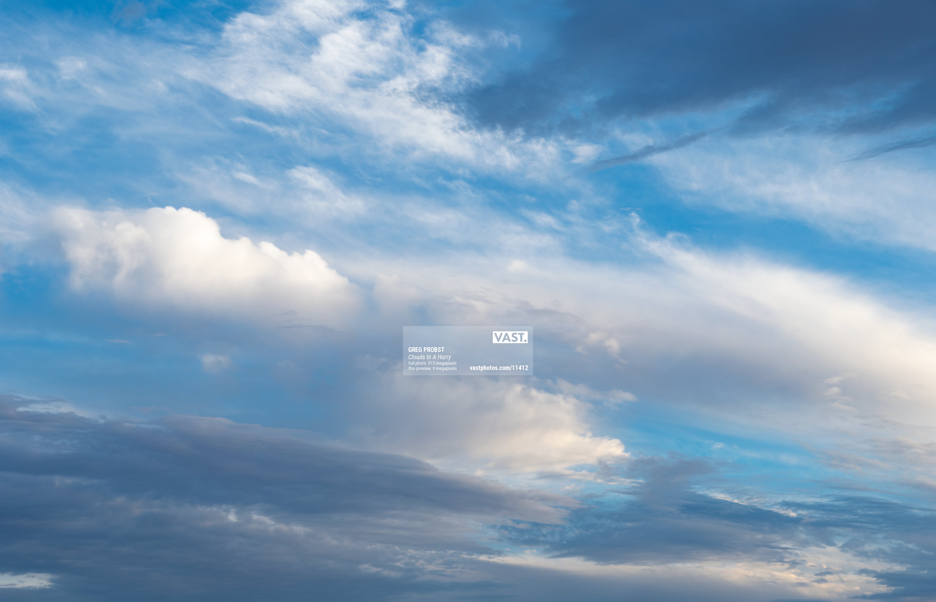 I titled this "Clouds In A Hurry" because of how high the wind was blowing. I wanted to make this image larger but the clouds were moving so fast that there just wasn't time to make enough single images that would stitch together so I chose this section of the sky and this is what I was able to make.