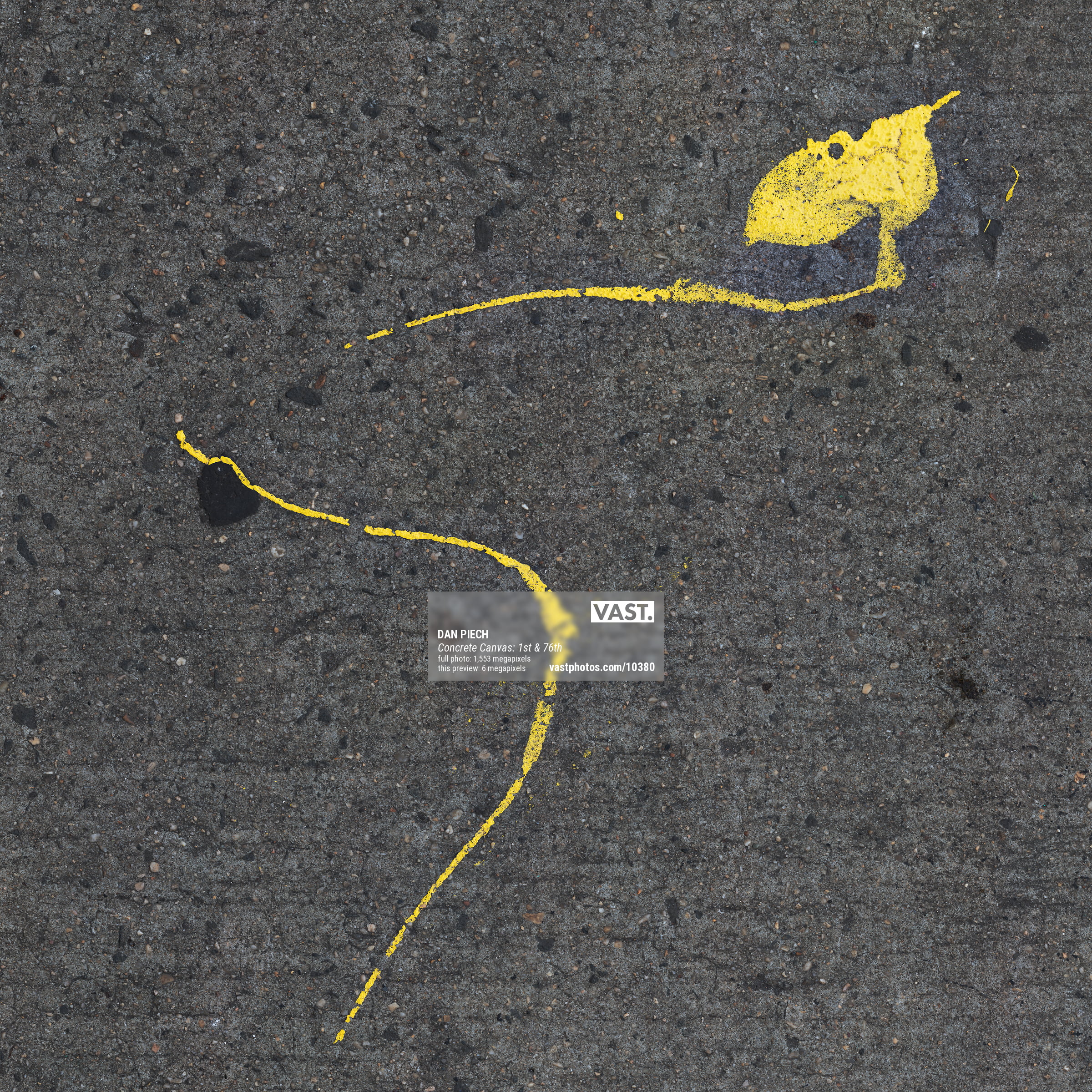 Dan Piech's Concrete Canvas series captures the accidental beauty that serendipitously occurs when the concrete beneath New Yorkers' feet is inadvertently graced by spilled paint, fallen debris, expanding cracks, chemical stains, and other delightful visual elements. An avid runner, Piech has spent over three years traversing every single Manhattan street in search of these overlooked "artworks" that have become part of the fabric of the city.