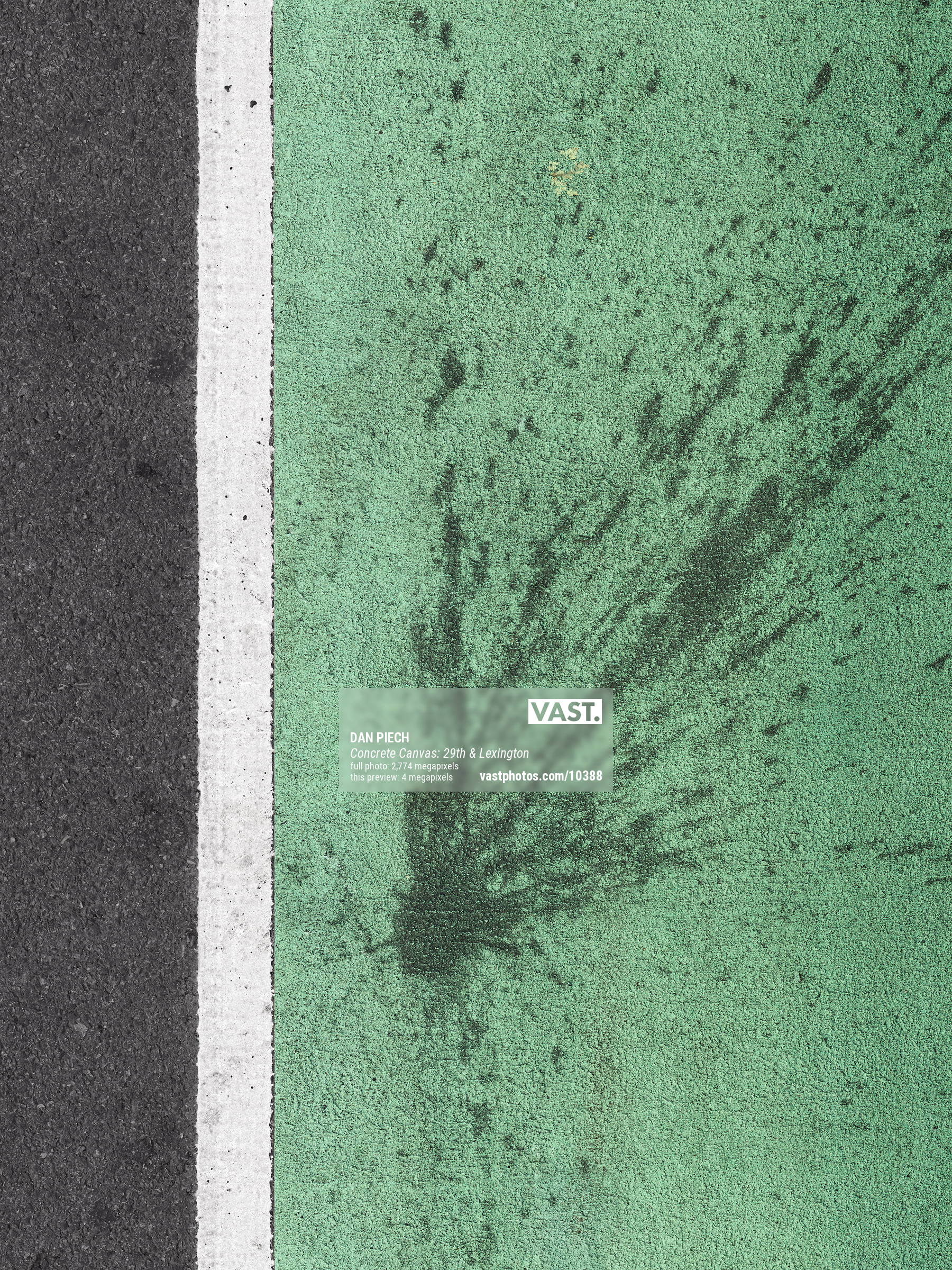 Dan Piech's Concrete Canvas series captures the accidental beauty that serendipitously occurs when the concrete beneath New Yorkers' feet is inadvertently graced by spilled paint, fallen debris, expanding cracks, chemical stains, and other delightful visual elements. An avid runner, Piech has spent over three years traversing every single Manhattan street in search of these overlooked "artworks" that have become part of the fabric of the city.