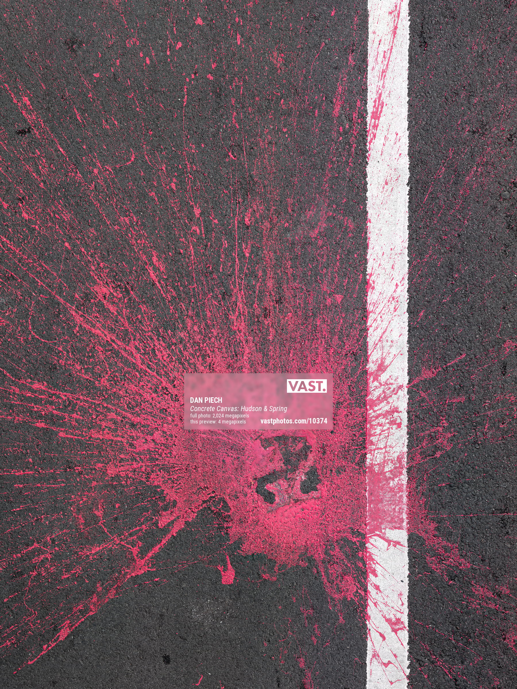 Dan Piech's Concrete Canvas series captures the accidental beauty that serendipitously occurs when the concrete beneath New Yorkers' feet is inadvertently graced by spilled paint, fallen debris, expanding cracks, chemical stains, and other delightful visual elements. An avid runner, Piech has spent over three years traversing every single Manhattan street in search of these overlooked "artworks" that have become part of the fabric of the city.