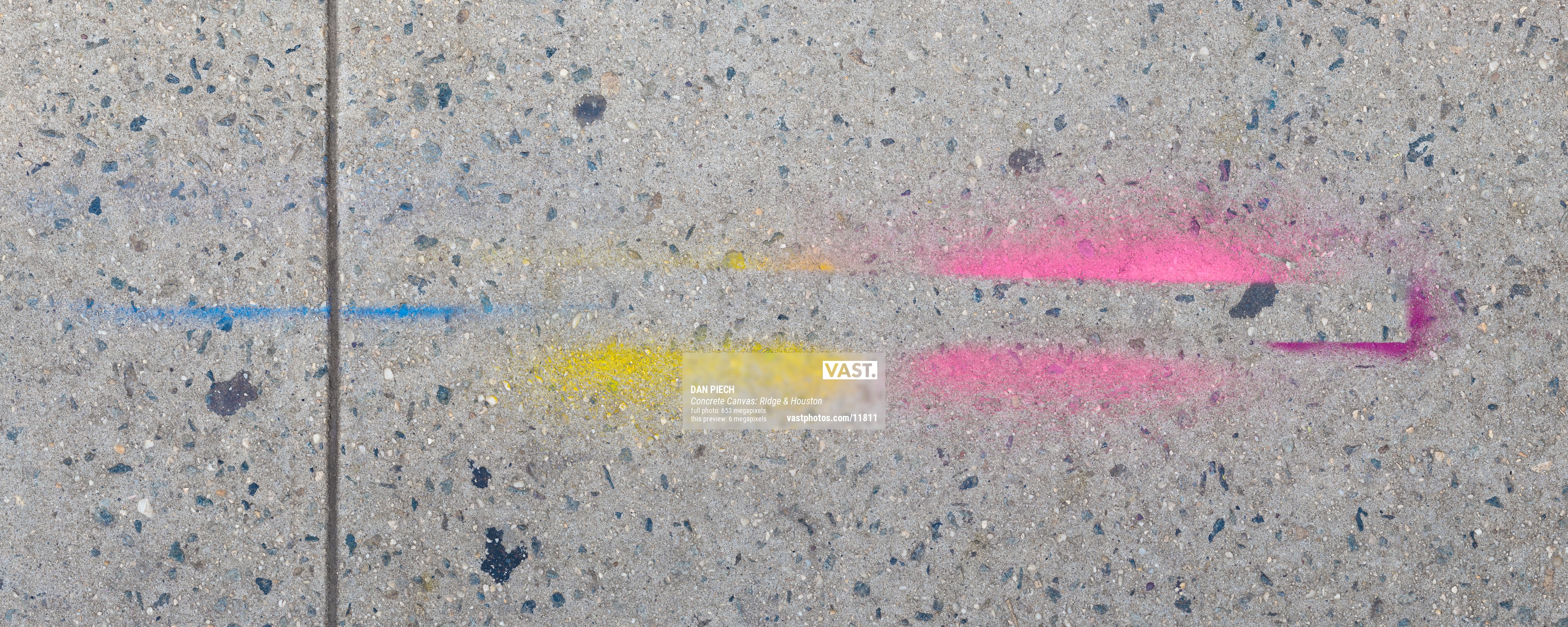 Dan Piech's Concrete Canvas series captures the accidental beauty that serendipitously occurs when the concrete beneath New Yorkers' feet is inadvertently graced by spilled paint, fallen debris, expanding cracks, chemical stains, and other delightful visual elements. An avid runner, Piech has spent over three years traversing every single Manhattan street in search of these overlooked "artworks" that have become part of the fabric of the city.
