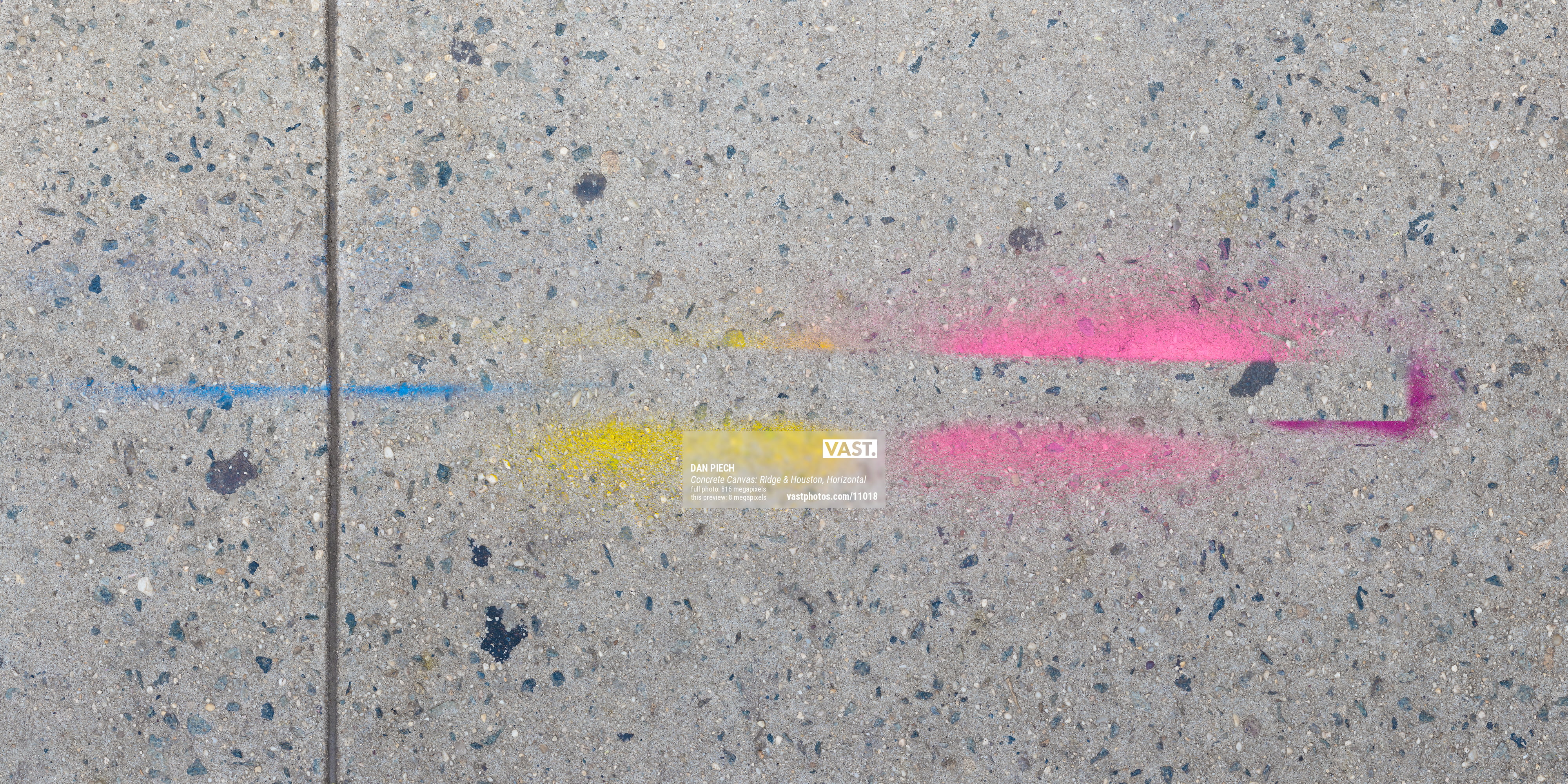 Dan Piech's Concrete Canvas series captures the accidental beauty that serendipitously occurs when the concrete beneath New Yorkers' feet is inadvertently graced by spilled paint, fallen debris, expanding cracks, chemical stains, and other delightful visual elements. An avid runner, Piech has spent over three years traversing every single Manhattan street in search of these overlooked "artworks" that have become part of the fabric of the city.