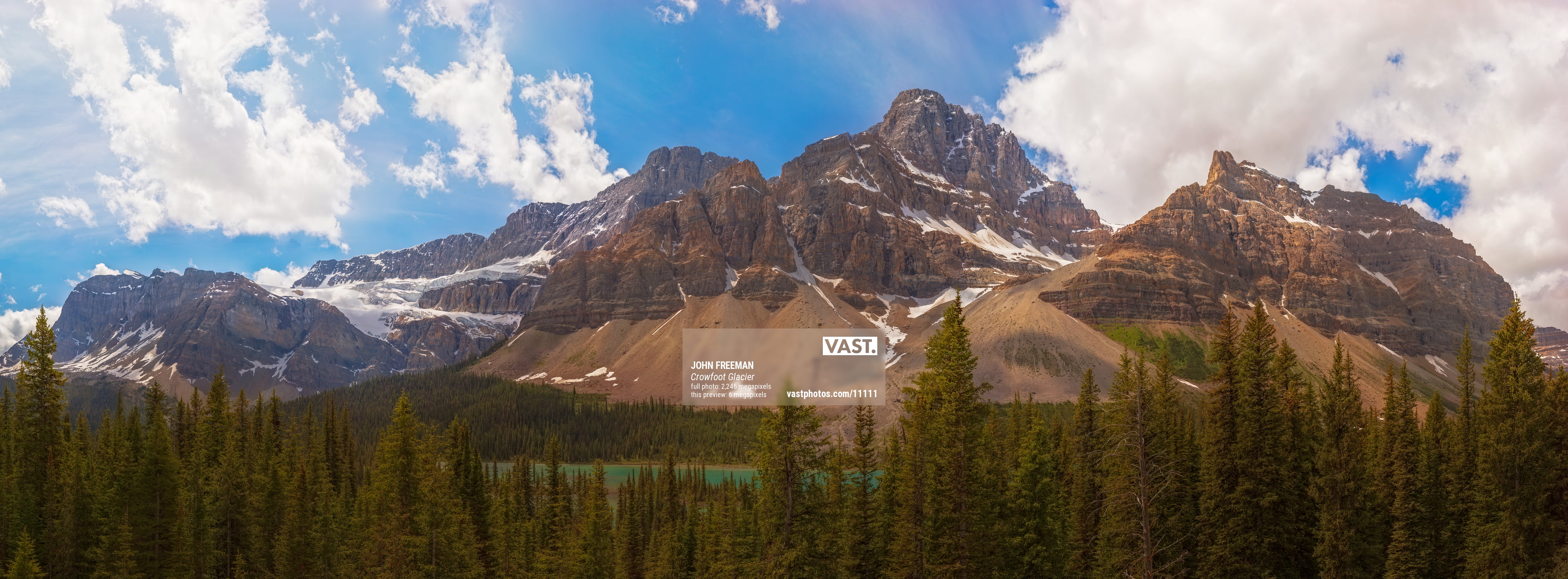 Crowfoot Glacier is 20-miles NW of Lake Louise and is visible from the Icefields Parkway, which is where this photo was taken. It lays on the flank of Crowfoot Mountain and it's run-off supplies the Bow River. When the early explorers first discovered it, it had three prongs, which gave it it's name. Over time, it has receded, and now there are only two prongs, but it still commands one's attention. The view looks at a vertical side of one of the prongs so several layers of ice, including blue, are visible