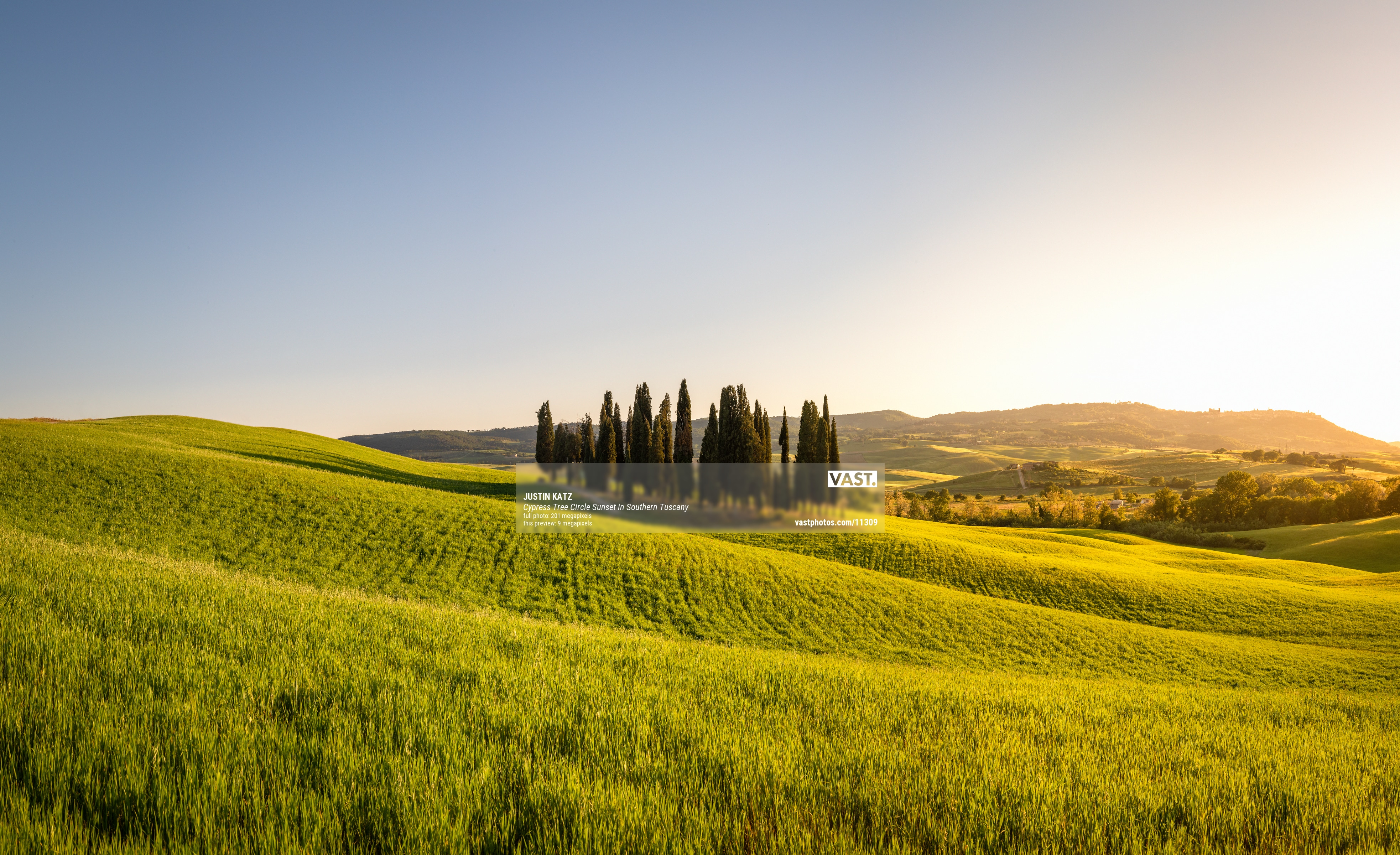 This circle of cypress trees is one of many such deliberate arrangements found in this area. Known as the Val d'Orcia, this picturesque farmland sits between the wine-famous hill-towns of Montalcino and Montepulciano.