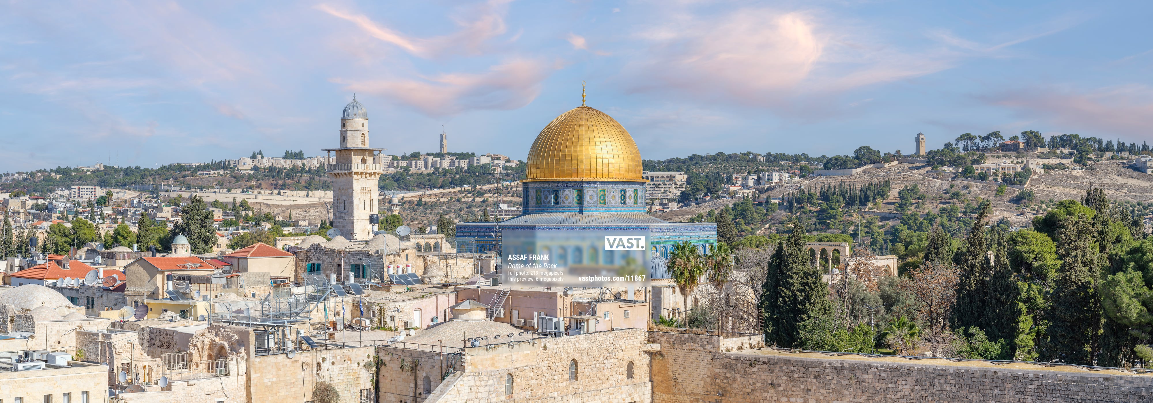 The photograph of the Dome of the Rock in Jerusalem is a stunning representation of historical grandeur and religious significance, captured with a keen eye for detail and composition. The Dome of the Rock, with its resplendent golden dome, stands as the centrepiece of this panoramic image, drawing the viewer's attention immediately. Its vibrant hue contrasts beautifully with the soft pastel colors of the sky, delicately painted with light pink and blue tones, creating a serene and peaceful atmosphere.
