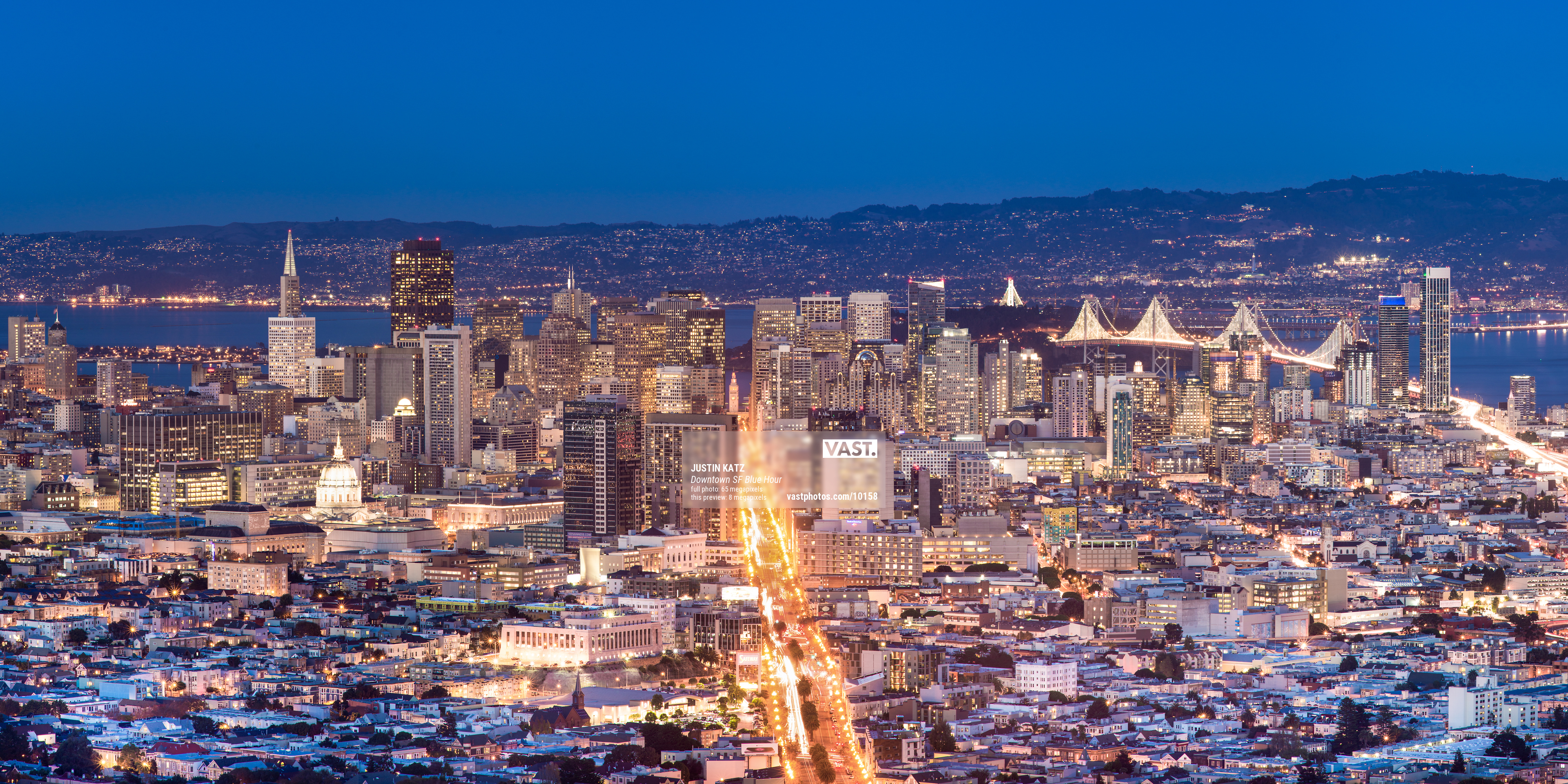 “Blue hour” is that brief but magical moment of twilight, either early in the dawn, or late in the dusk, when the sun is at a significant distance below the horizon and the residual, indirect sunlight takes on a predominantly blue hue. This VAST photo captures San Francisco at that special moment.