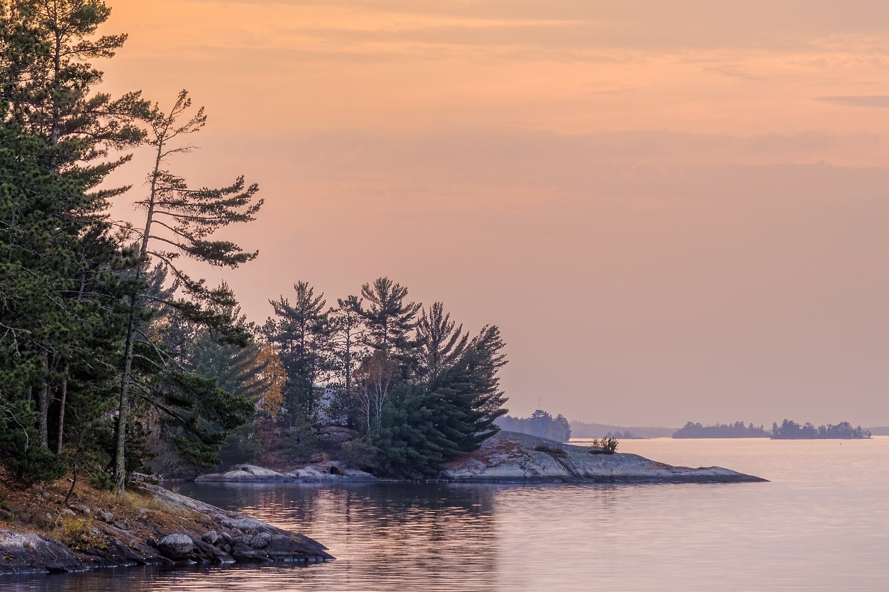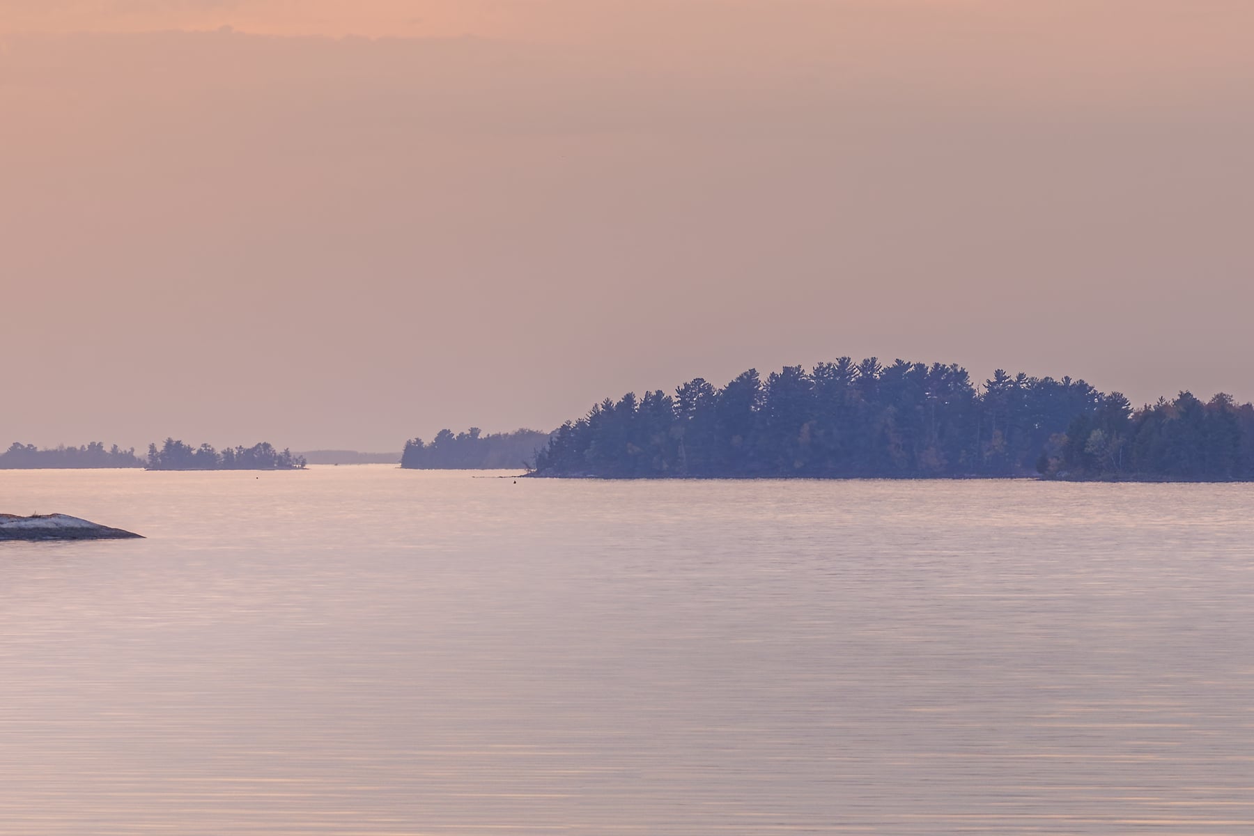While exploring the shoreline of Lake Kabetogama, I eventually found a narrow stretch of rock that opened to the west and framed a single island as a natural focal point. From there it became a waiting game. Weather changes quickly in Voyageurs; evenings that begin calm and promising can turn into wind and rain long before sunset. It took several nights of watching storms roll through and light fizzle out before everything finally aligned clouds, color, and a gentle enough breeze to keep the water smooth.