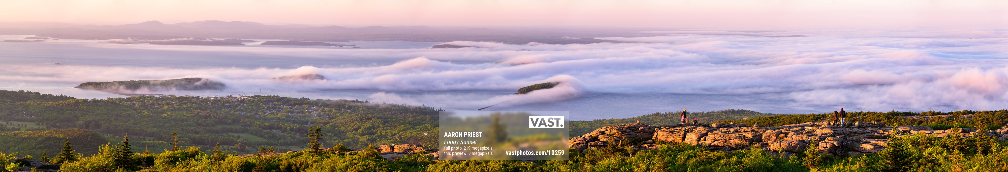 I took this VAST photo of fog and sunset over Bar Harbor from the top of Cadillac Mountain in Acadia National Park on June 6, 2016, 7:50 PM. It is stitched from 28 photos with Photoshop (it was too large for Lightroom to stitch). The sun was setting fast and the fog was moving fast too, so I shot a single row at 140mm, f/8, ISO 64, 1/20 sec. I didn’t have time for a second row or longer focal length before the sun had set behind a bank of clouds and the beautiful light disappeared. I chose f/8 and focused on the ridge where the hikers were because I liked the town and fog being slightly out of focus in the distance compared to the sharp outline of the ridge catching the last of the sun’s golden glow.