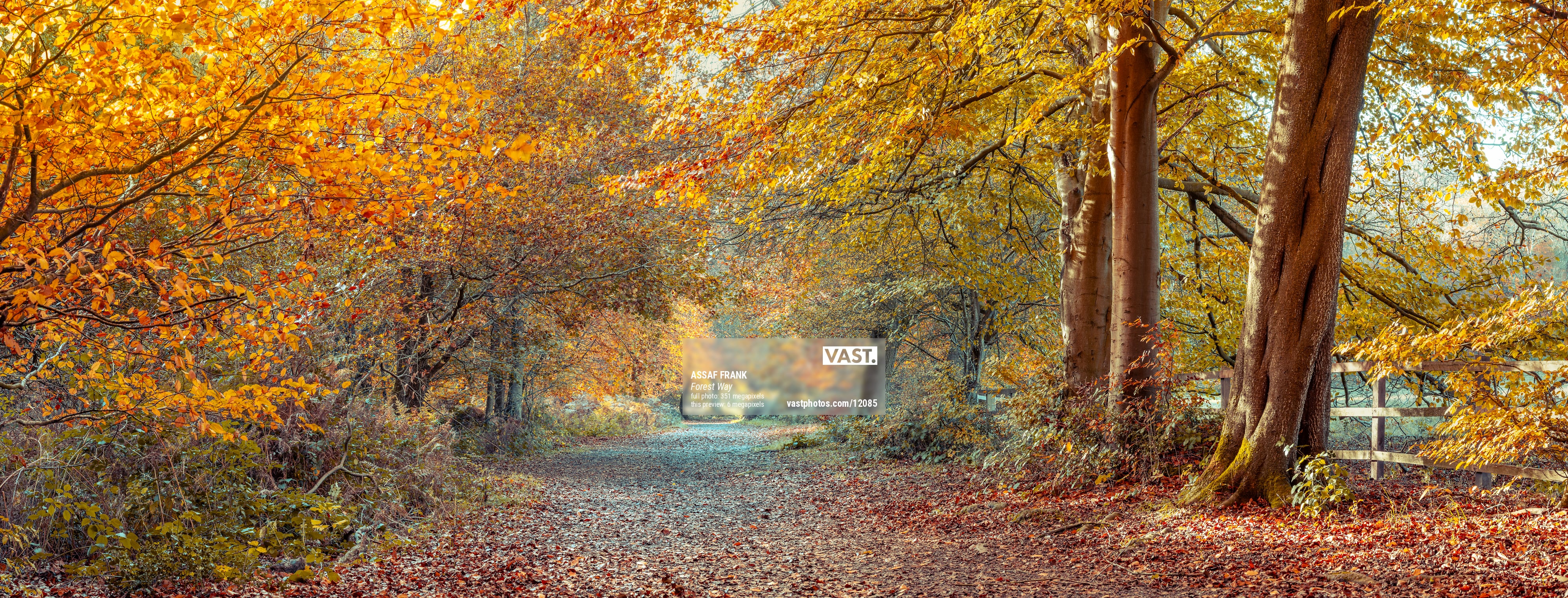 To the right of the pathway, a wooden fence runs alongside the trail, partially hidden by the foliage, adding a charming countryside touch to this serene landscape. The rich tones of the autumn leaves contrast beautifully with the cool blue sky peeking through the branches, while the distant view of the path disappearing into the horizon creates a sense of depth and tranquility. The soft interplay of light and shadow adds a dreamy, almost magical quality to the scene.