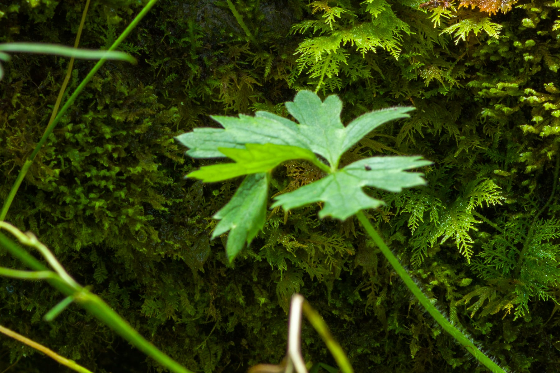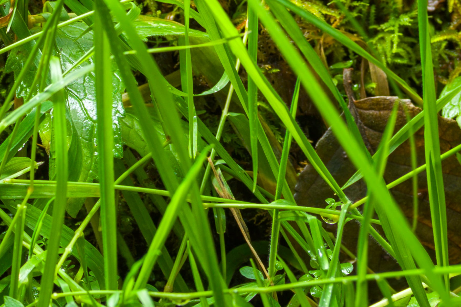 Surrounding the log, the forest floor teems with life, characterized by tall grasses and a variety of foliage, suggesting a moist, thriving woodland ecosystem. The close-up perspective emphasizes the detail and diversity in the scene, from the delicate mushroom caps to the intricate textures of the moss. This serene moment captures the essence of forest life, revealing the hidden beauty that lies within the undergrowth, often unnoticed yet vital to the health of the environment.
