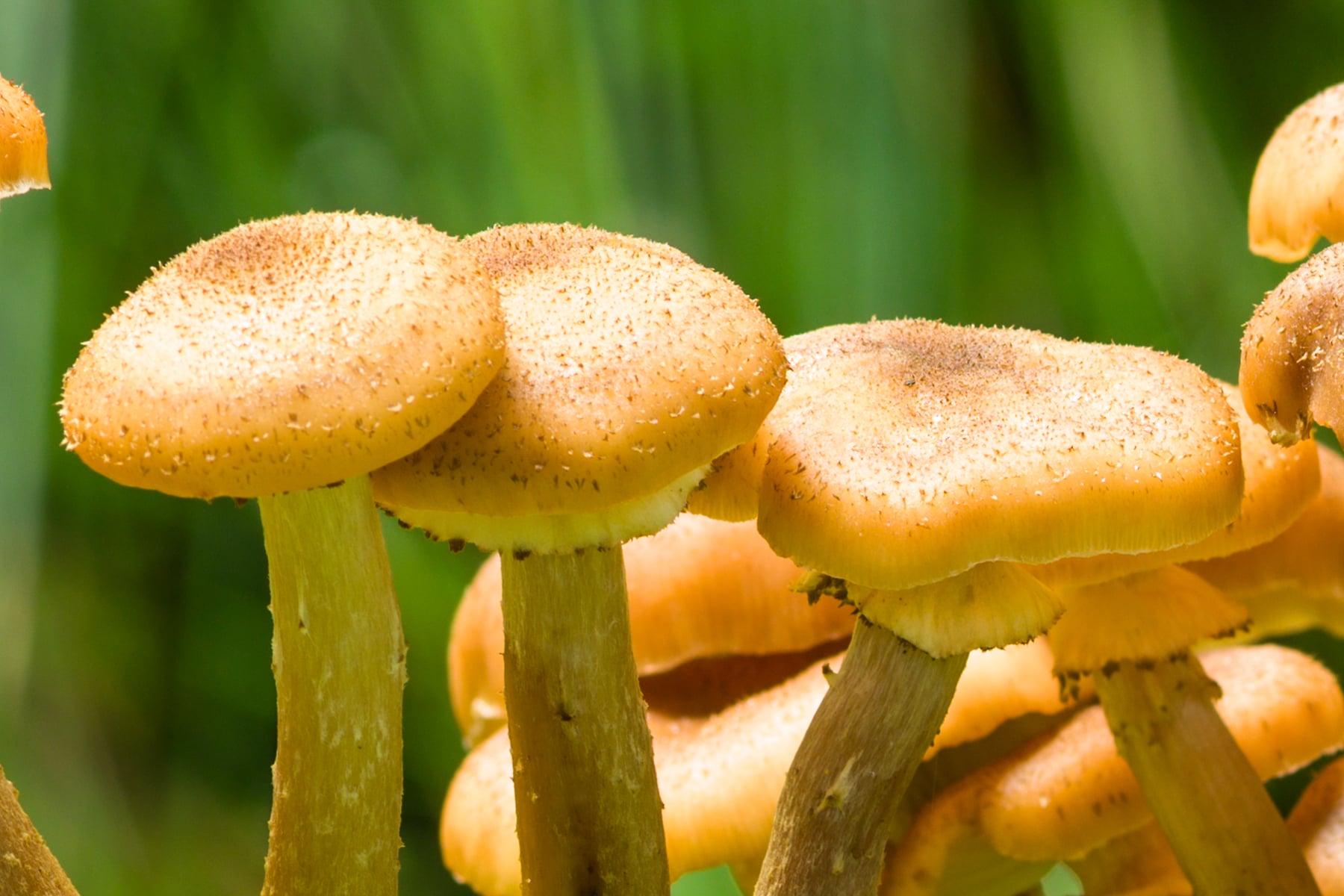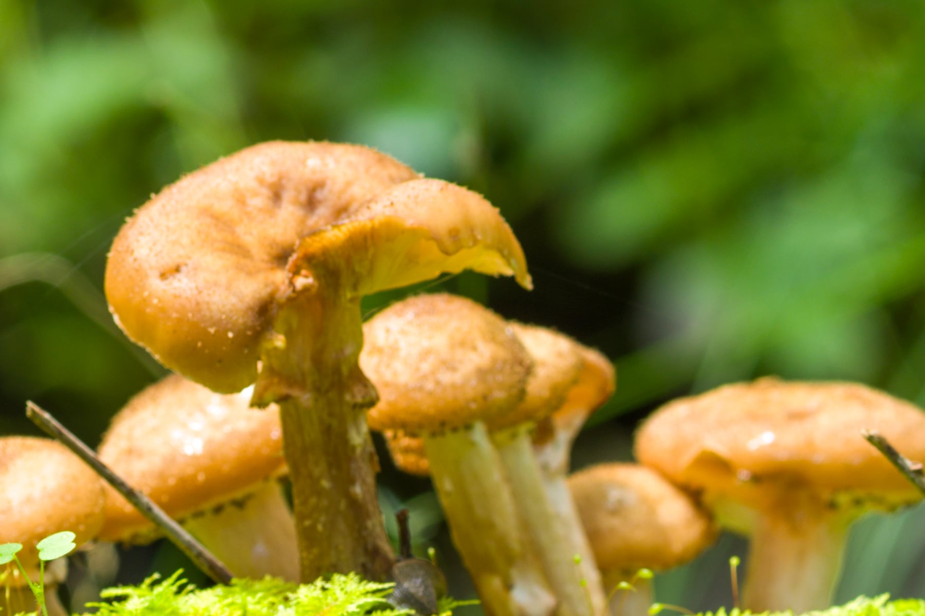 This captivating image showcases a dense cluster of golden-brown fungi growing vibrantly along a moss-covered tree trunk deep within a forest. The contrast between the earthy tones of the mushrooms and the lush green moss creates a rich tapestry of natural color and texture. The fungi appear to thrive in the damp, shaded environment, nestled amid a carpet of greenery. The moss not only blankets the fallen log but also highlights the decay that supports new life—a beautiful representation of nature's cycle of renewal.