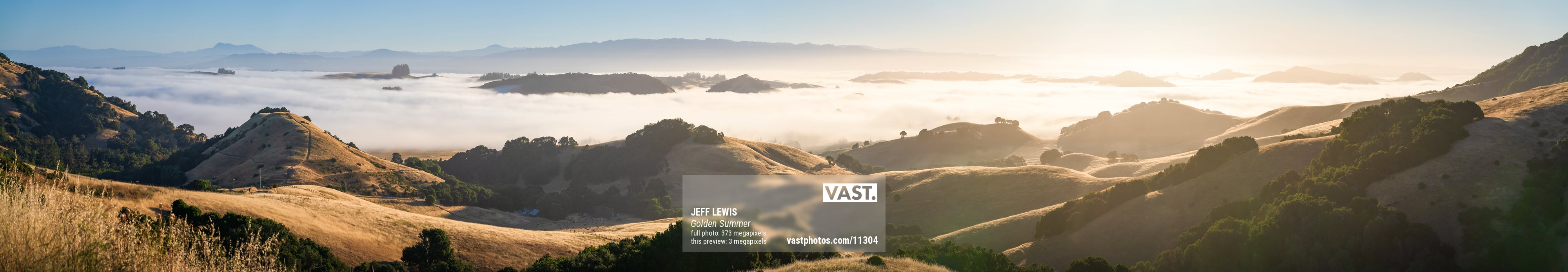 This view is commonly photographed in the winter, with Tule fog. It is absolutely gorgeous then. However, most photographers avoid it in the summer, when low fog in the valleys is much more rare. However, I realized summer has a much more favorable sun angle -- in the winter, the sun rises behind a big hill, and the hills just don't get the same stunning golden light. So, seeing a rare day of low fog in the summer, I gave it a try, and it was everything I hoped for! Plus, the two other photographers around both left just as the sun came up, so I enjoyed this spectacular view all to myself. It was quite a clear morning, so I was able to make this VAST photo!
