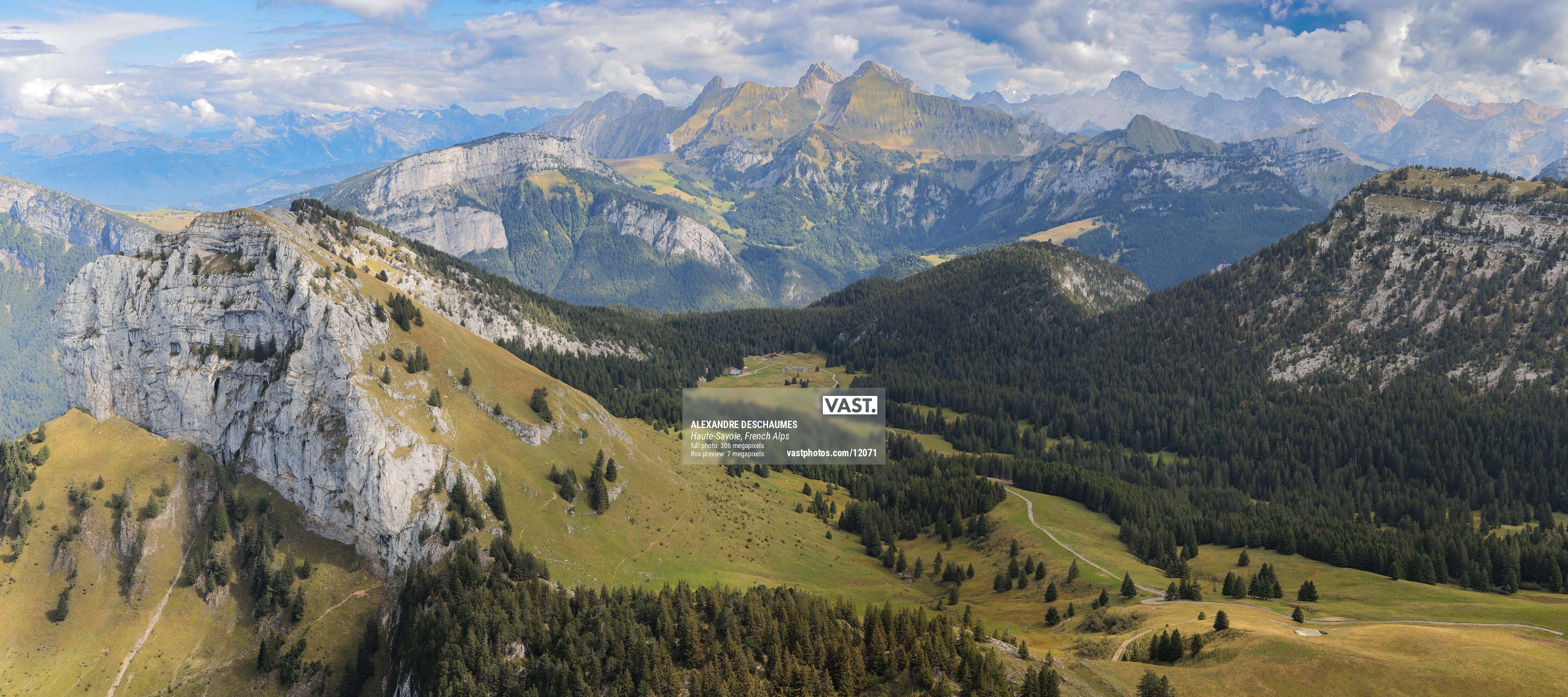 This panoramic view, captured from the Pointe de Sous-Dine in the Bornes massif, Haute-Savoie, offers a breathtaking display of alpine landscapes in September. The scene stretches across rolling meadows, rocky cliffs, and dense forests, all framed by the distant silhouettes of mountain ranges under a dynamic sky. If you observe closely, you can spot an "étagne" (female ibex) standing proudly on the summit of the Roche Parnal, a subtle yet majestic presence in this wild environment.