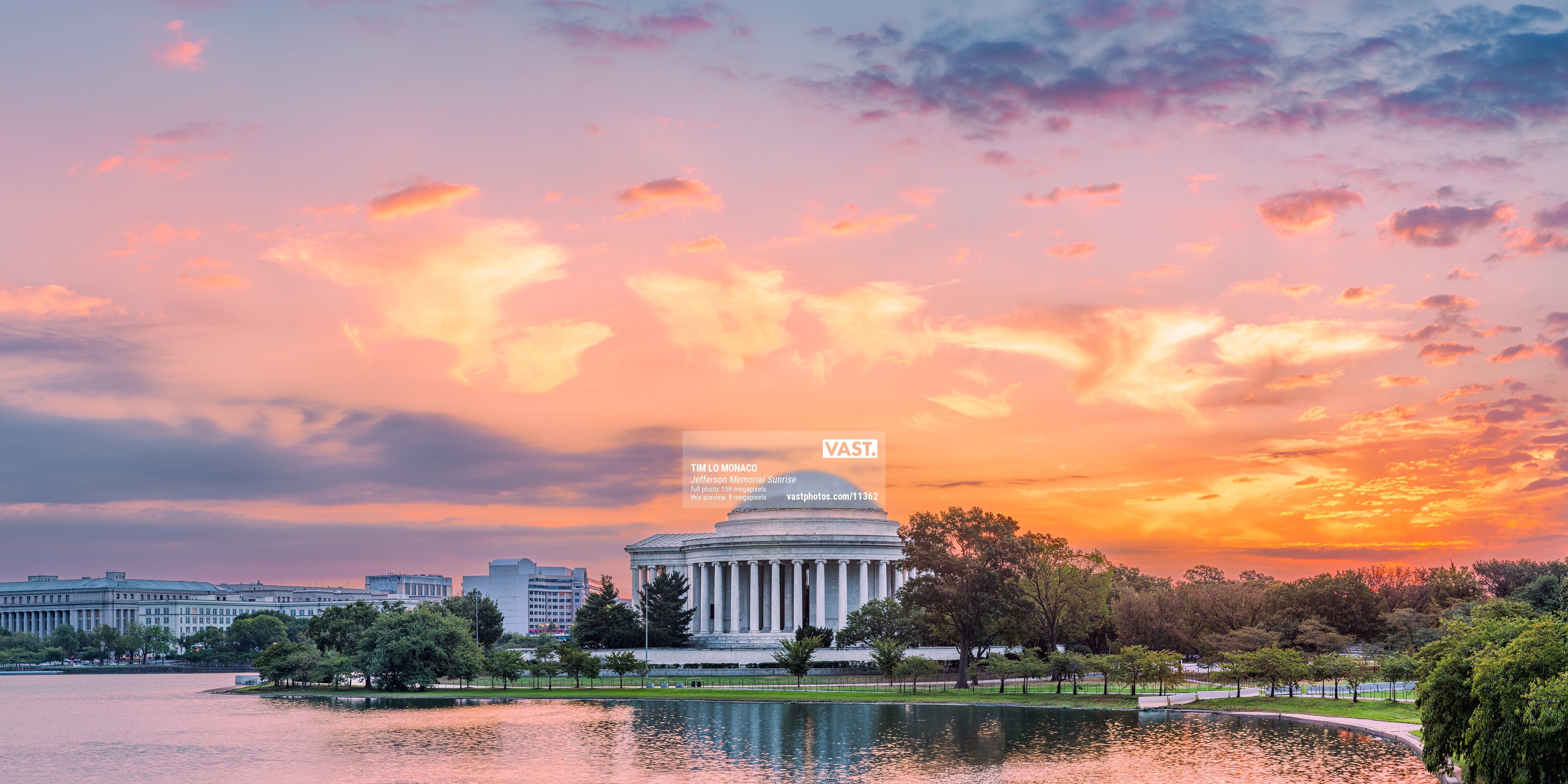 This is a crop of single-row panoramic stitch at sunrise in the late summer of 2016. The Tidal Basin Bridge (Ohio Drive Bridge) provides sweeping views of the Tidal Basin, lined with nearly 3800 Cherry Trees. In September, at a distance these trees could be mistaken for the myriad deciduous trees with their beautiful green canopy. In late March/early April these aged cherry trees burst with new life. During the peak bloom of the cherry blossoms in Washington, D.C., their canopy and flowering blossoms happily hang over the edge, engulfing one in a flowering tunnel as they walk around the Tidal Basin. Washington, D.C. is not a large city like New York City with the plethora of tall buildings as far as the eye can see. Rather it is filled with many unique sites and monuments which make up the cohesive whole; one of those iconic sites being the Cherry Blossoms in D.C. along the Tidal Basin on the National Mall. This is the place to go to visit the Martin Luther King, Jr. Memorial and Thomas Jefferson Memorial, and enjoy views of the Washington Monument, White House, and government buildings.