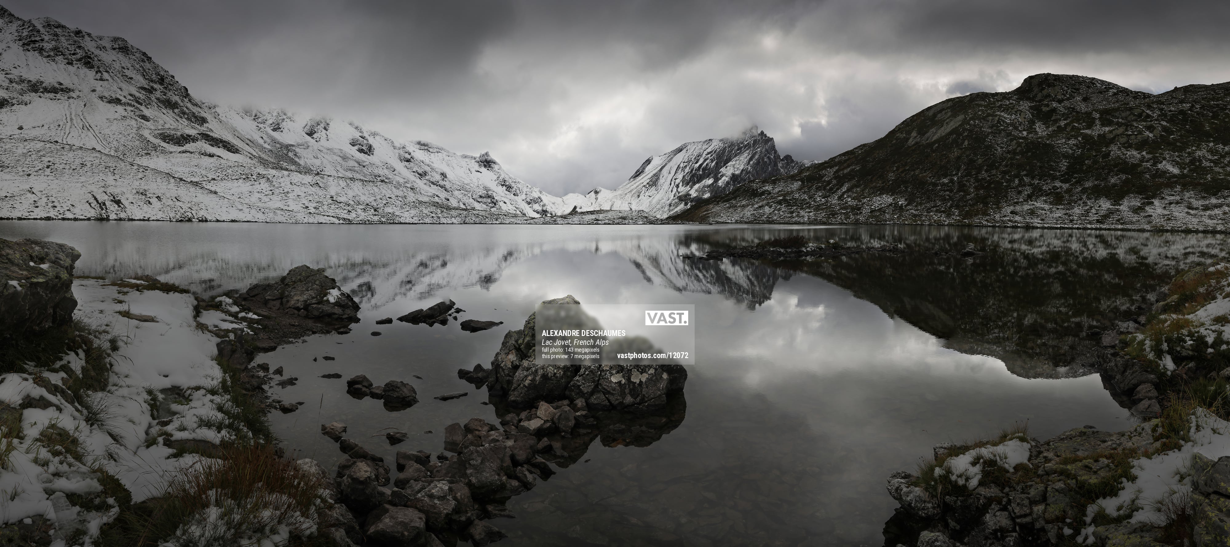 This panoramic photograph captures the shores of Lac Jovet, nestled within the Contamines-Montjoie Nature Reserve, as the first snows of the season begin to settle. The scene is enveloped in a cold, atmospheric stillness, where the muted tones of early winter contrast with the rugged alpine terrain. The lake's surface mirrors the dramatic sky and snow-covered slopes, creating a perfect balance between land and reflection.