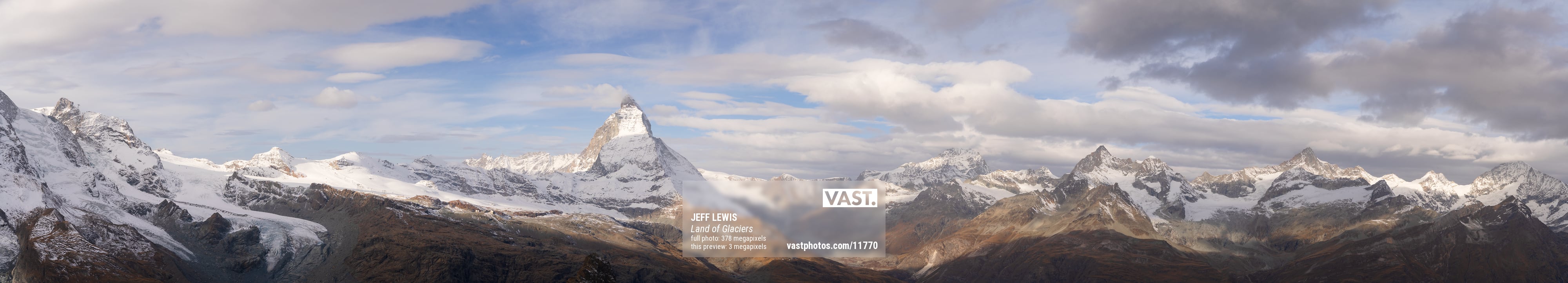 I took this photo facing the Matterhorn and its friends, high above the village of Zermatt, on a lovely morning with fluffy clouds and plenty of sunshine.