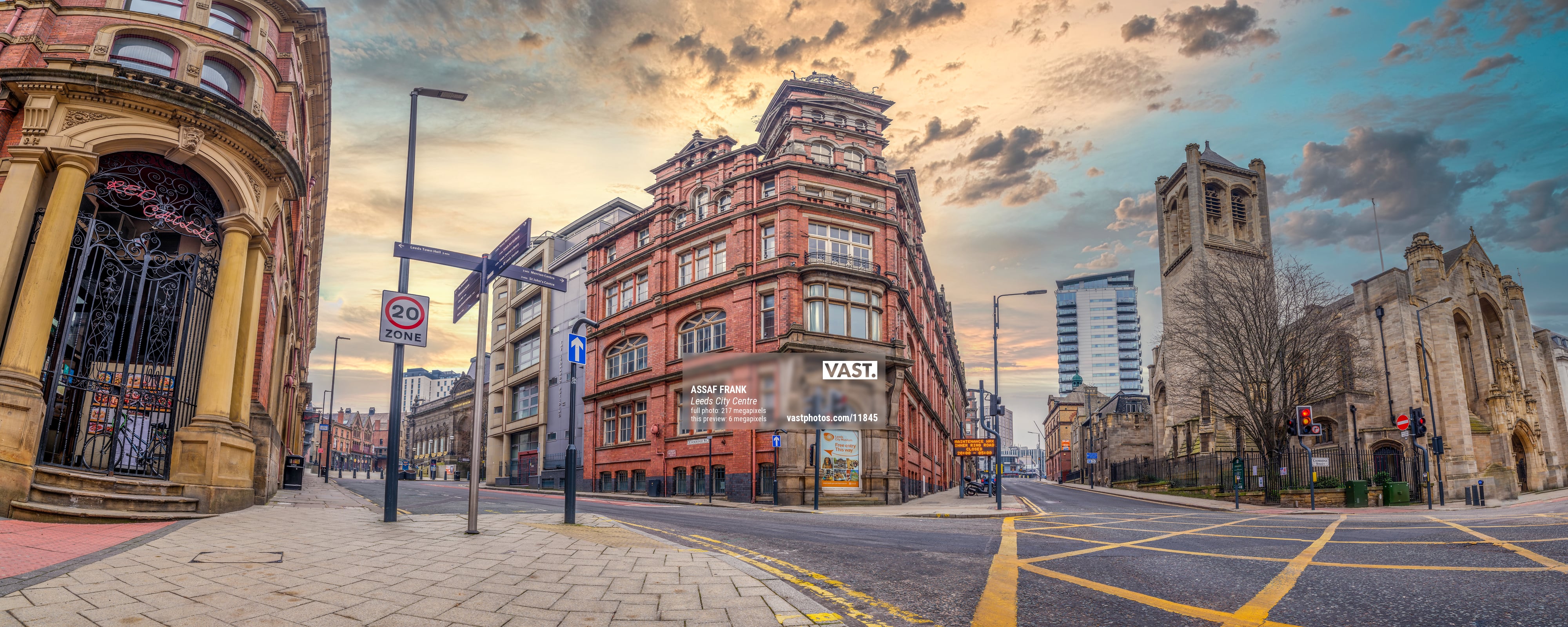 This panoramic photograph captures a street's architectural charm and urban essence in Leeds, UK. The image showcases a mix of historical and modern buildings, creating a harmonious blend of the old and new. The warm, golden hues of the sunset cast a beautiful glow on the red-brick structures, enhancing their intricate details and adding a sense of warmth to the scene.
