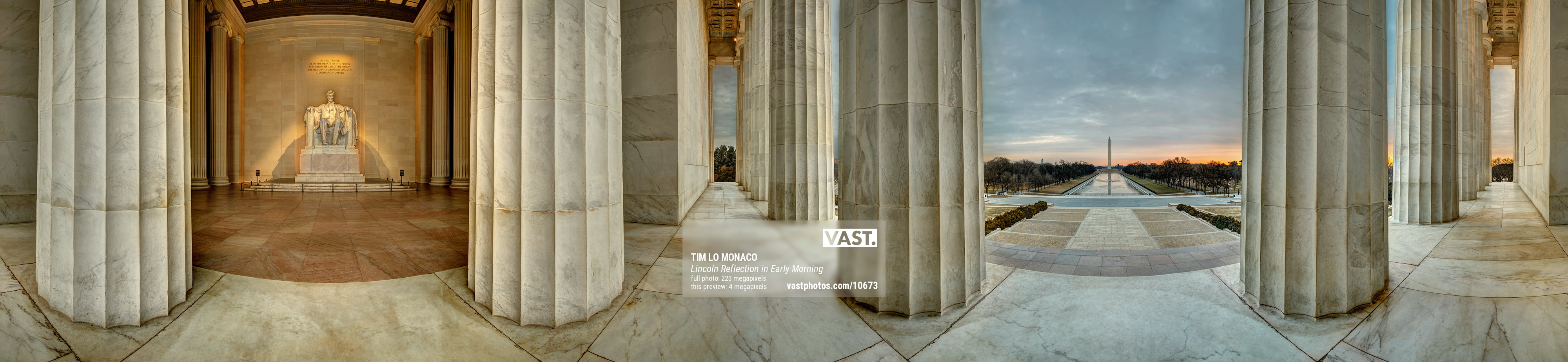 The full circle of this single row panorama makes for the initial feel that it was shot with a wide-angle lens but leaves the viewer, many of whom have visited the Lincoln Memorial, wondering where or how exactly this image was taken. The moment of realization that the marble statue of Lincoln and the Reflecting Pool with the Washington Monument are in reality, opposite each other, fascinates me to this day. I enjoy how this method makes for a surreal feel while still being a fairly straightforward image of those simple elements that gracefully come together to make this historic monument.