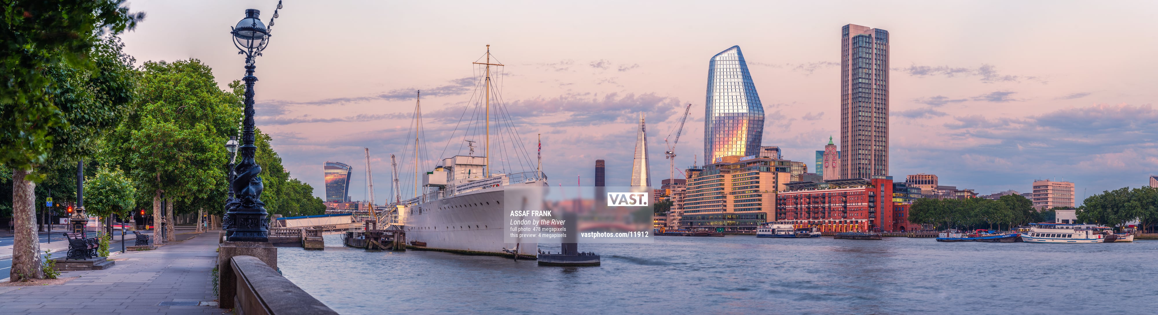 This panoramic image captures the stunning London city skyline as seen from the banks of the River Thames. The tranquil waters of the river reflect the modern architecture of iconic landmarks like The Shard and One Blackfriars, blending seamlessly with the historic elements of the city. The anchored ship in the foreground contrasts with the sleek skyscrapers, creating a juxtaposition of the old and the new, which London is renowned for. Trees lining the riverbank add a touch of greenery, framing the urban scene beautifully.