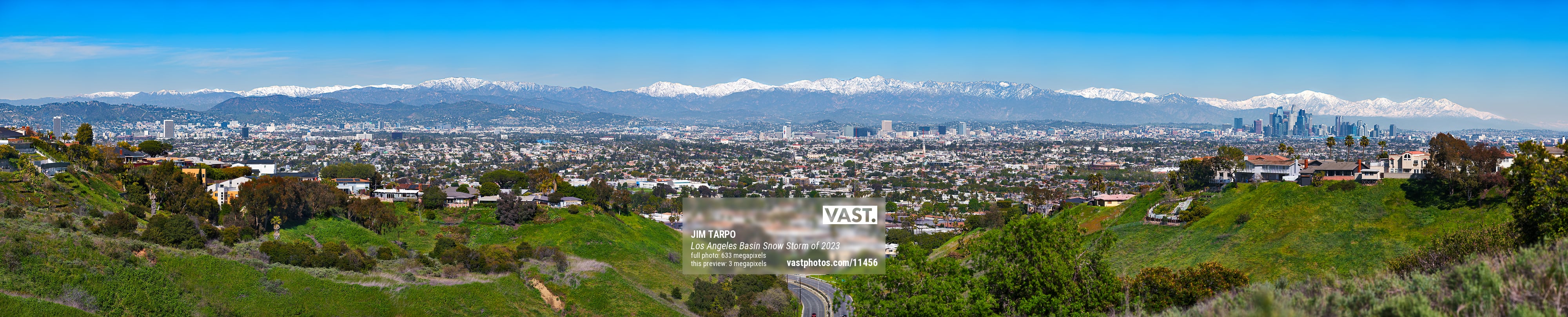 Once the powerful Feb. 2023 blizzard in the Los Angeles area mountains had moved along and the clouds disappeared, the snow covered peaks showed the extent of the rare winter storm. In this photo you can see the results of the snow from Hollywood all the way to downtown Los Angeles.
