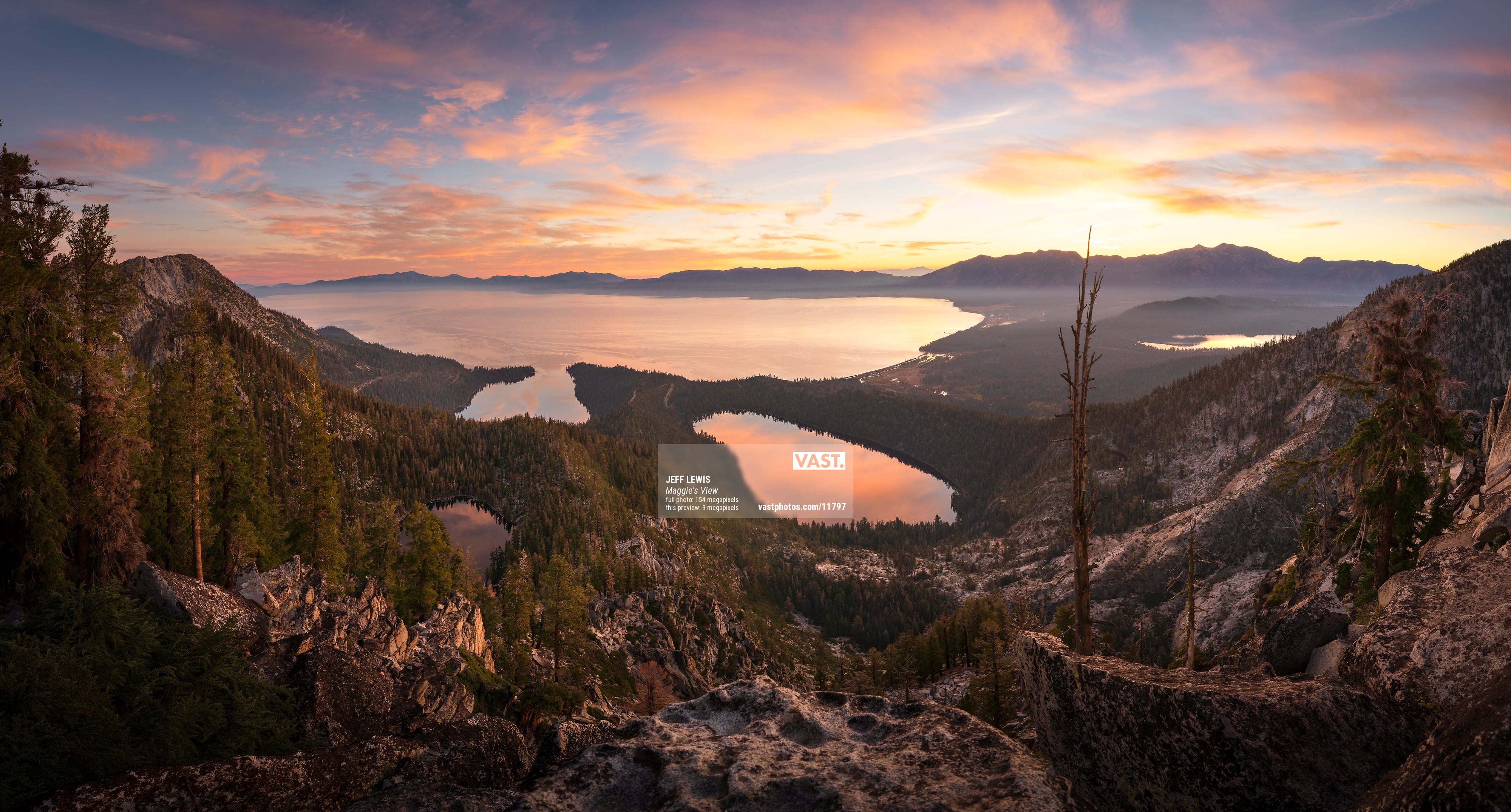 Shortly after, my sunrise model ran, and confirmed that there would likely be a nice sunrise the following morning. I said, nope, we ain't goin' home tonight -- this is my chance for redemption. So we called our dogsitter and said we'll need one more night, found a campground near the lake, pitched our tent, woke up at 5am, and I hiked up 2000' to this summit to catch this lovely sunrise over several of the lakes and bays of the southern Tahoe basin. And THEN, only then, could we finish the drive home!