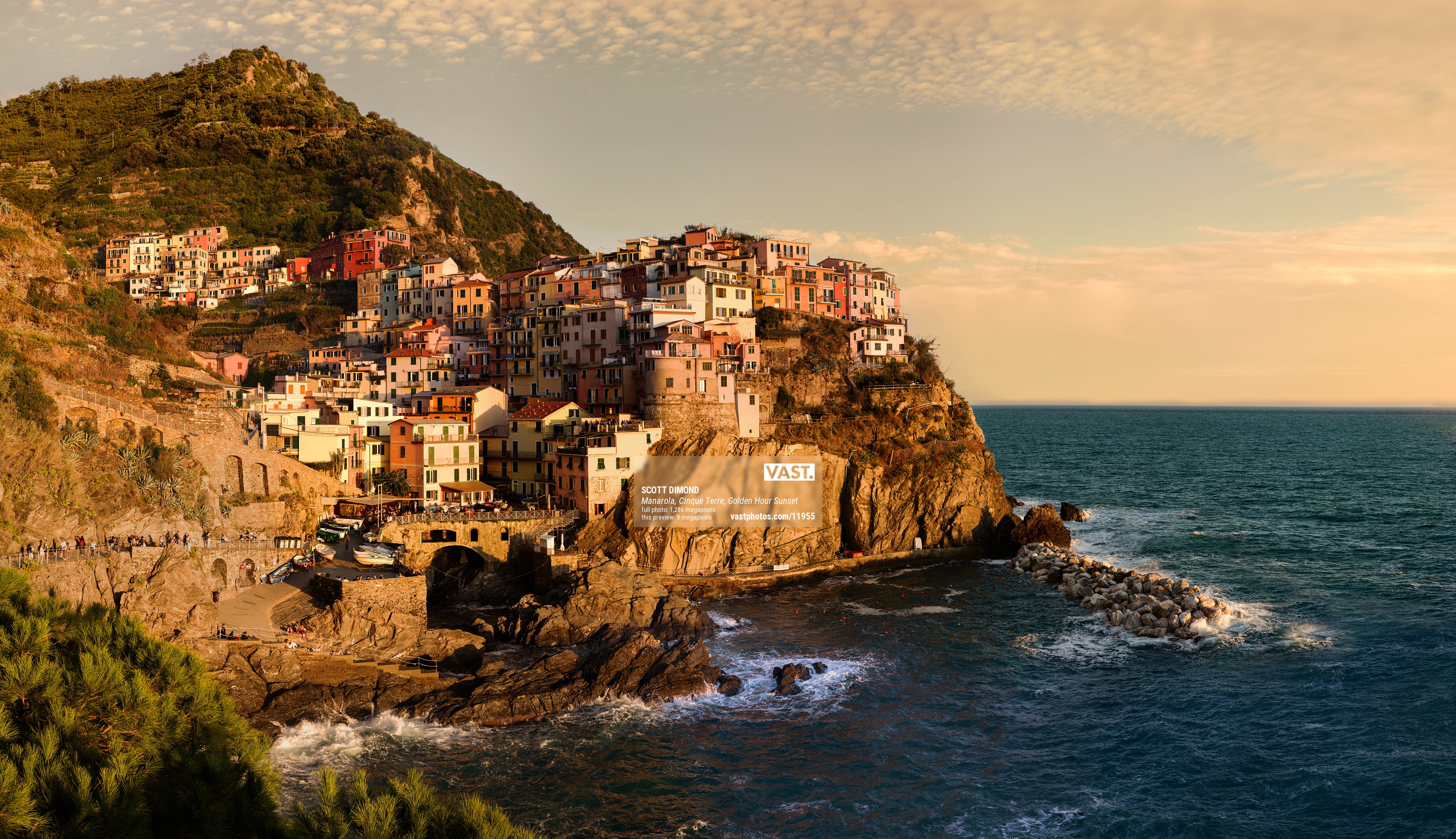 Creating an ultra-high-resolution VAST photo of Manarola has been on my wish list for a long time. You could even say it was a bucket list item. Of the five towns that make up Cinque Terre, it has always been Manarola that I long to photograph. Yes, the others are nice, but the coastline extending out into the sea to the north of town is what makes Manarola so special. From that point is a wonderful view back toward the village; a spectacular display of multicolored houses stacked on one another up the cliffs. Whether standing along the pathway taking in the view or enjoying an Aperol spritz in a coveted seat at the wonderful Nessun Dorma restaurant, this is the place to be. And the Holy Grail experience is to be there during a sunlit golden hour light show.Â