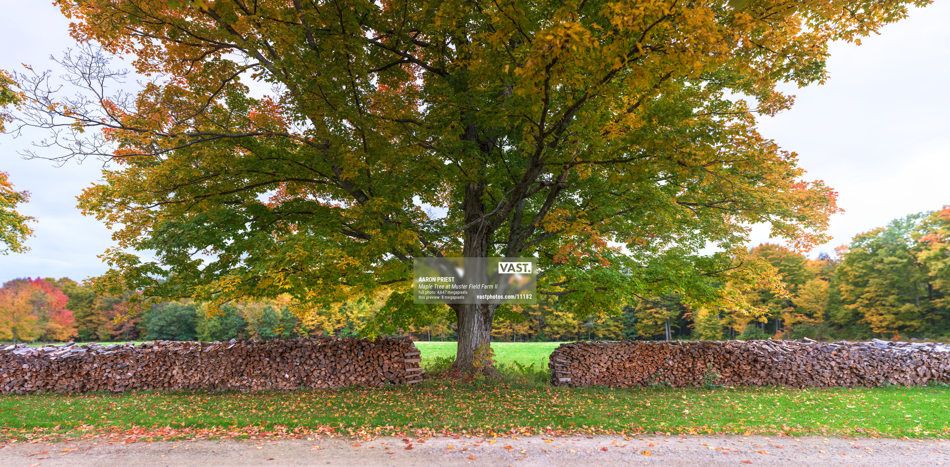 This large maple tree stands tall between rows of woodpiles at Muster Field Farm in Sutton, New Hampshire, October 10, 2021, 18:16 – 18:26.