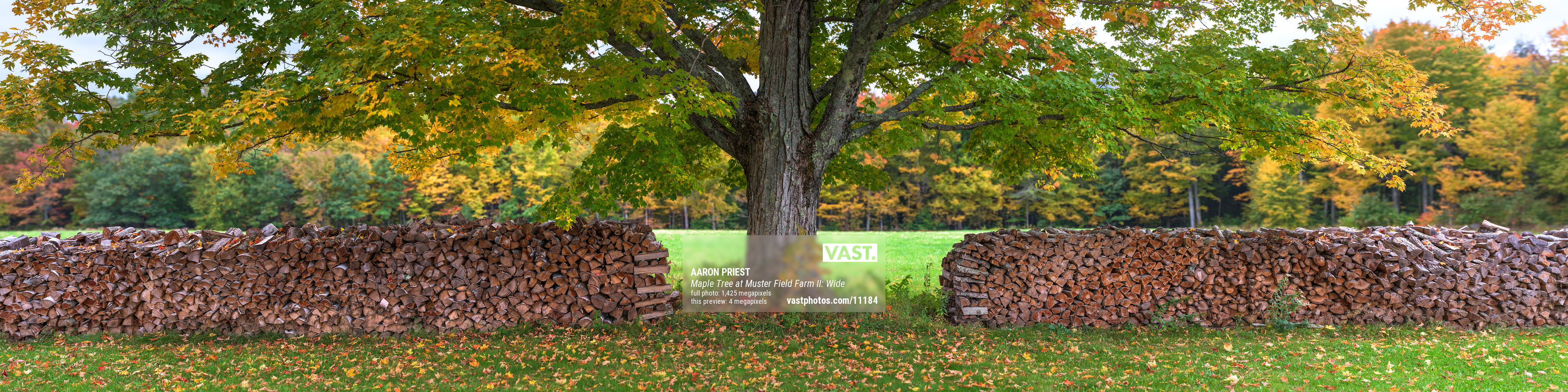 This large maple tree stands tall between rows of woodpiles at Muster Field Farm in Sutton, New Hampshire, October 10, 2021, 18:16 – 18:26.