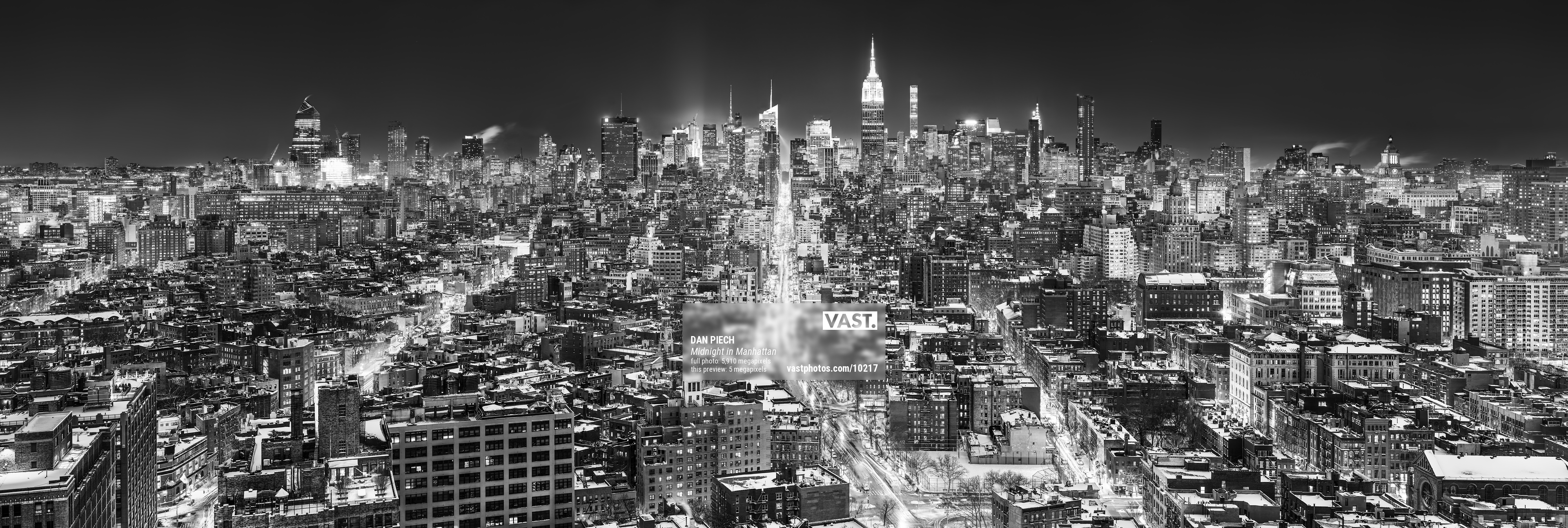 As soon as the last remnants of clouds from the storm cleared, I began the multi-hour process of exposing the 252 long-exposure images that comprise this exceptionally high resolution VAST photo. As I did, midnight came and went, but the energy of the city never diminished. Cars continued to race up 6th avenue, ferrying passengers to evening activities. Windows continued to glow, hiding weekend festivities behind them. Spotlights continued to dance skyward from the heart of Times Square. And friends continued to romp down snow-covered sidewalks, joyously reveling in the winter wonderland.
