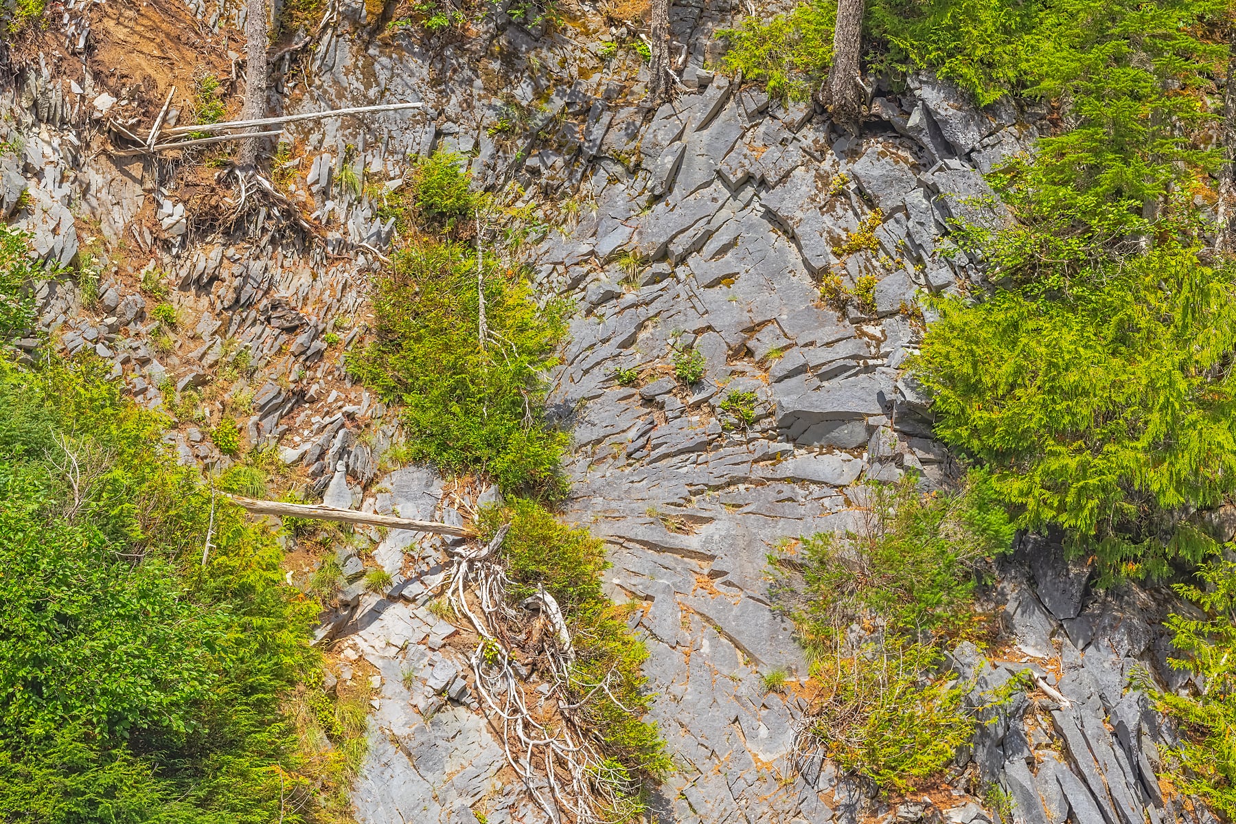 At the end of the short but steep trail, the entire 168-foot-high waterfall is visible. The vista is not only about dramatically falling water but also the rock that creates the steep drop. Here the Paradise River plunges over the edge of a relatively recent flow of hard Andesite lava that abuts much older rock. This lava’s cooling was accelerated by contact with the icy surface of the glacier that once filled this valley. The Paradise River runs clear, not milky, because it originates from snowfields, not debris-laden glaciers.