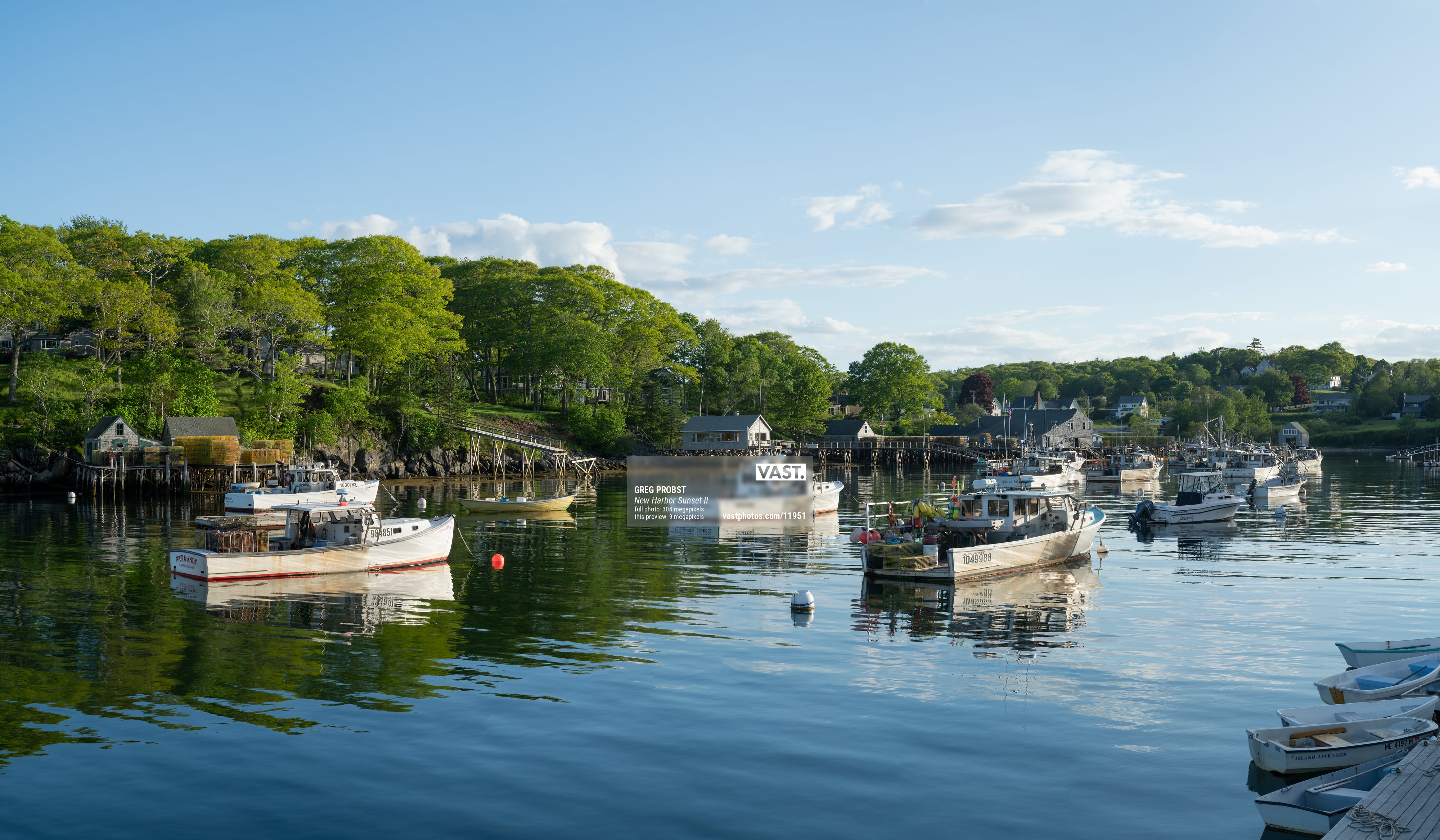 304 megapixels! A very high resolution, large-format VAST photo print of a beautiful harbor in New England with fishing boats, peaceful water, homes, and a blue sky; photograph created by Greg Probst in New Harbor, Maine.