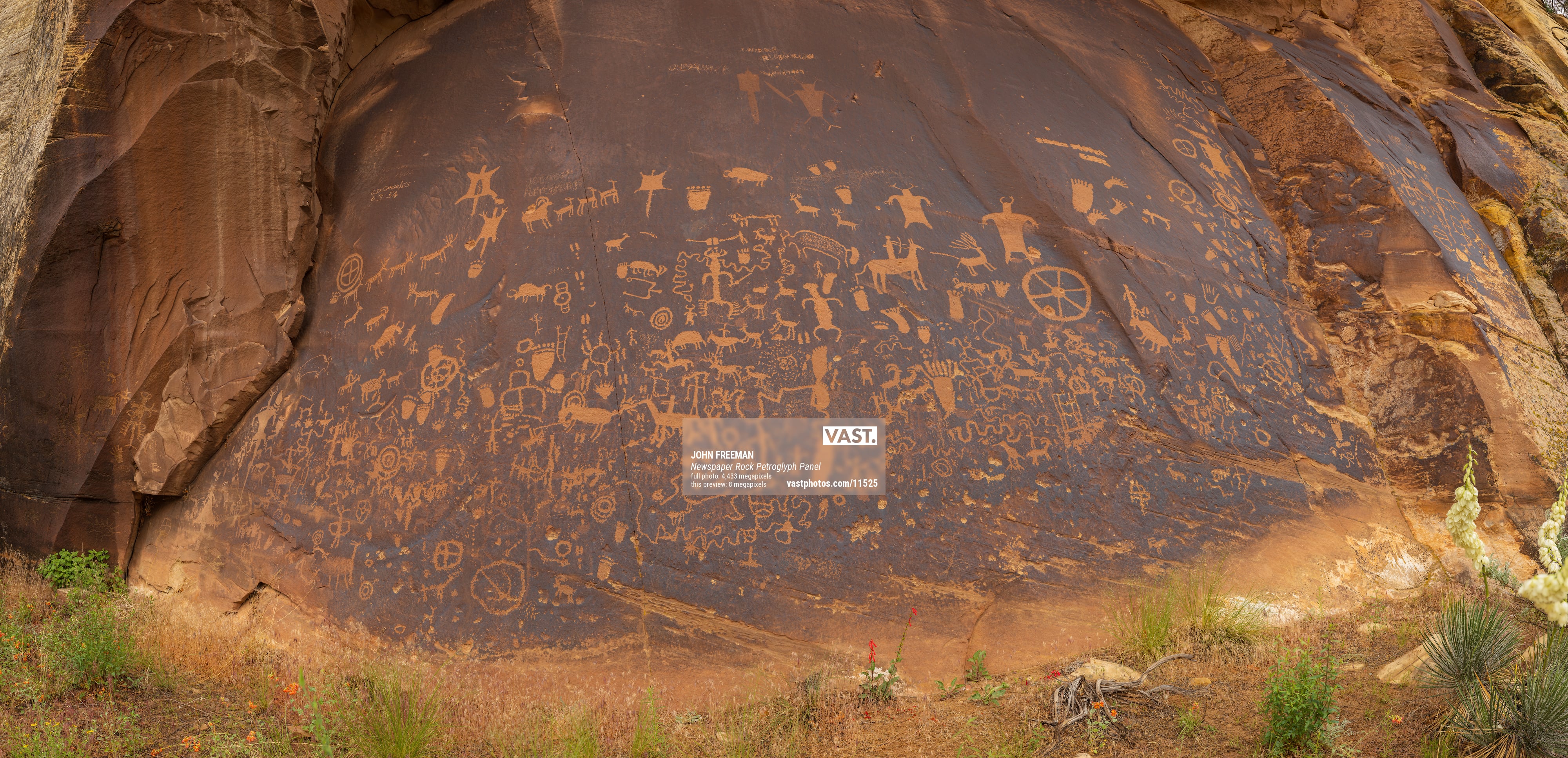 Newspaper Rock is perched just above the banks of Indian Creek on the eastern edge of the Bears Ears National monument, a large flat rock panel tucked under a small overhang preserves the stories of people who lived in and passed through this area for the past five centuries. Long recognized as a special place to multiple cultures, Newspaper Rock is among the first sites listed on the National Register of Historic Places in this region. The images at Newspaper Rock include animal pelts, figures of riding horses, and broad-shouldered figures with elaborate head decorations. Close examination will reveal numerous images of feet with six toes. Paw and foot prints are in evidence throughout the panel. Many animals are represented including dear, elk, bison and bighorn sheep. One of the images appears to be a rider shooting an arrow at an elk or deer. One of my goals of shooting this image is to create a ultra high resolution image of the location to preserve it for future generations.