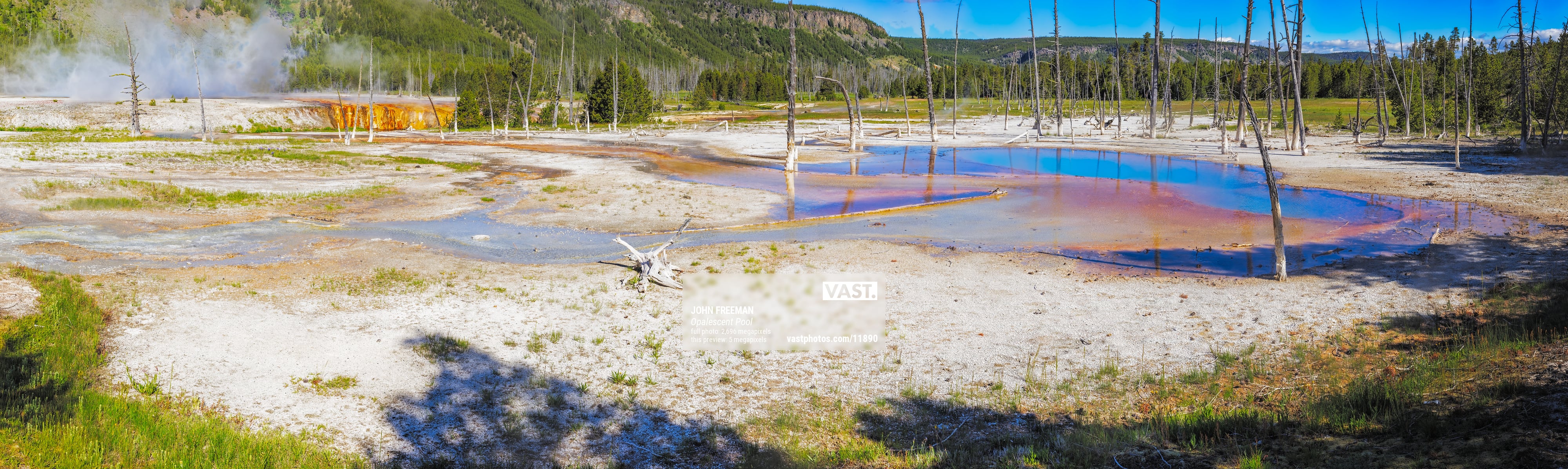 The Opalescent Pool is not an active hot spring but rather is fed by Spouter Geyser up stream from it. Thus the water is cooler at around 144°F and different bacteria grow in the pool resulting in it’s unique colors. Dead trees with silica-solidified bases surround the pool and stand in the runoff.