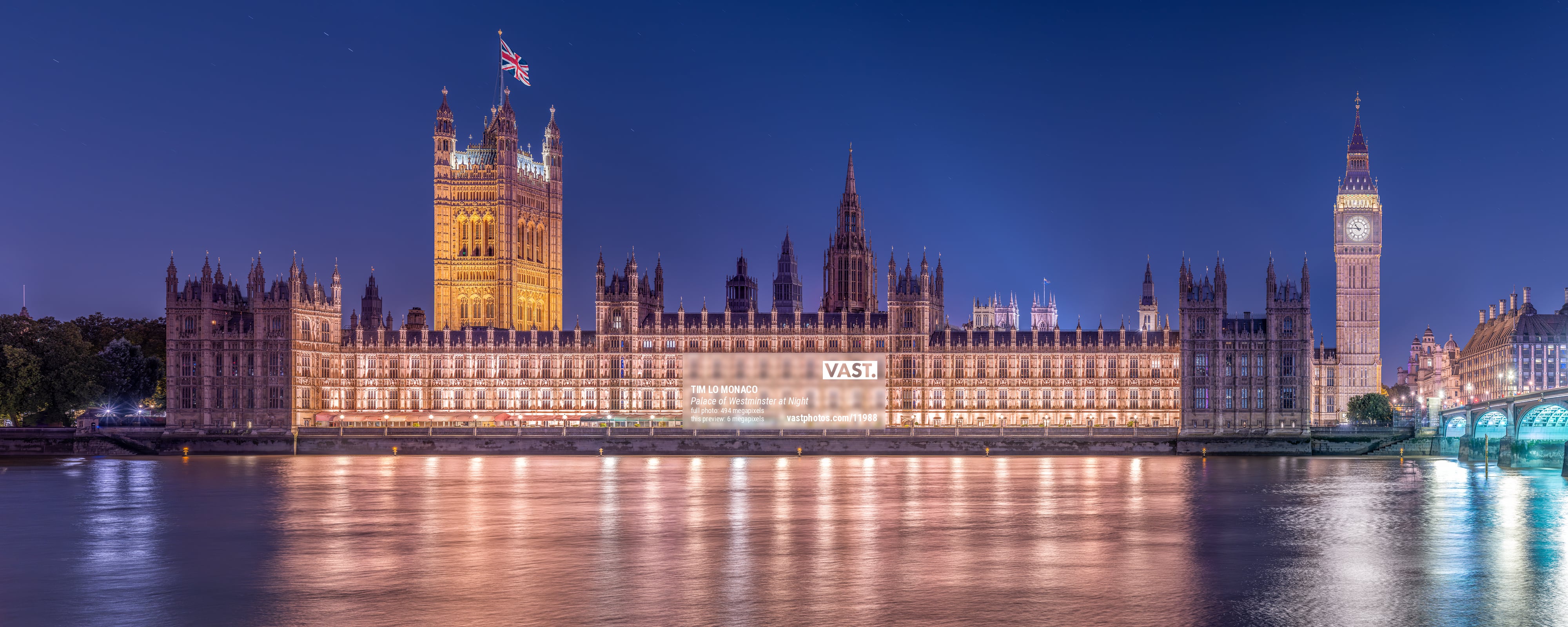 To my knowledge, this VAST Photo is still the highest resolution photo of The Palace of Westminster and Big Ben in London ever photographed. At nearly 500 megapixels, it can be printed nearly 10 feet long with no loss of detail. The high resolution allows for making extremely large fine art prints or murals and produces a hyper-realistic look unlike that of traditional fine art photography. It provides the viewer unrestricted access to the most intricate details of the Palace of Westminster façade. It’s gothic architecture with its decorative patterns, lancet windows, and many statues can all be seen in striking detail. I’m always enthusiastic to photograph beautiful architecture. Capturing the Palace of Westminster and Big Ben at nighttime made for a great way to finish the day in London.