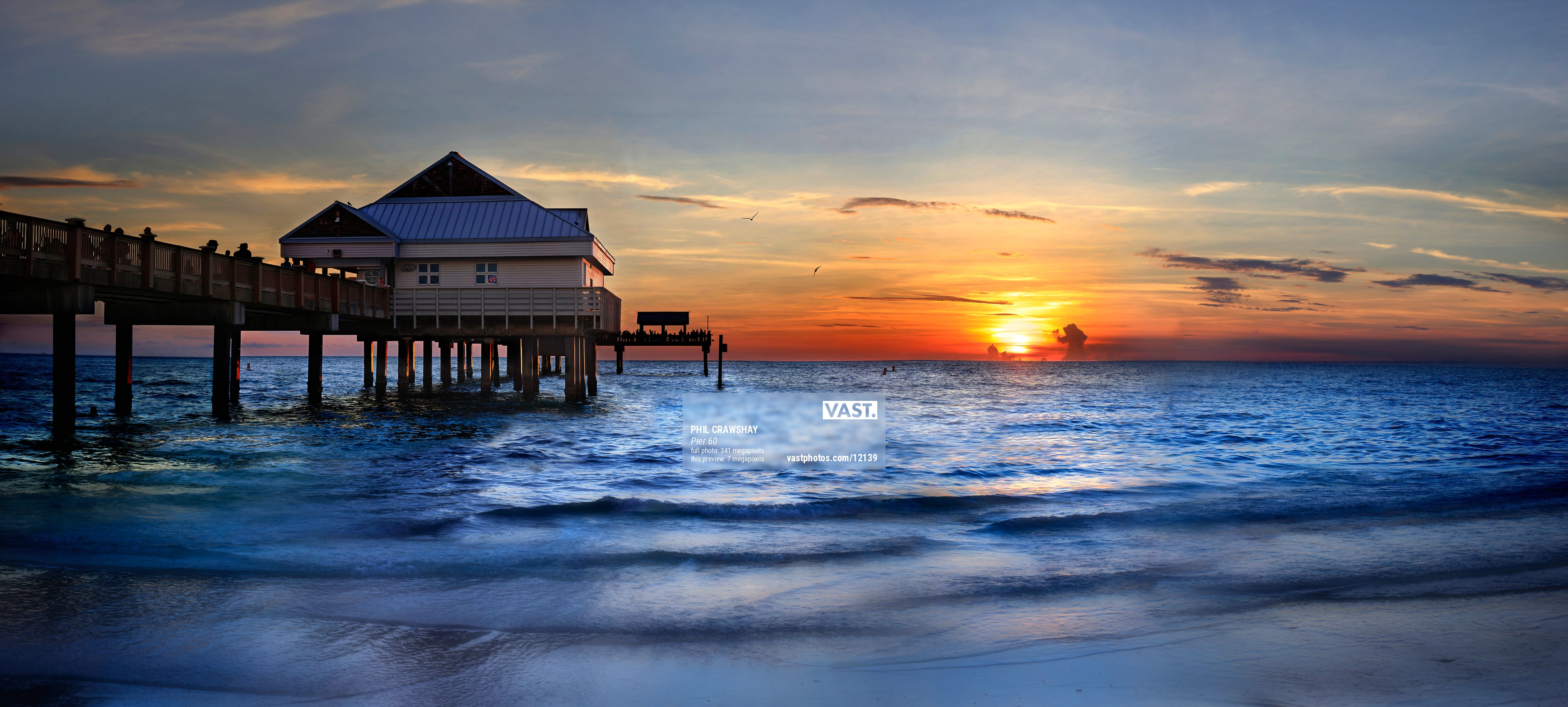 Pier 60 at Clearwater Beach, Florida, taken at sunset with the pier positioned on the left side of the frame. The scene captures the warm, glowing colors of the sun as it dips below the ocean, casting golden and blue tones across the sky and reflecting off the calm water.