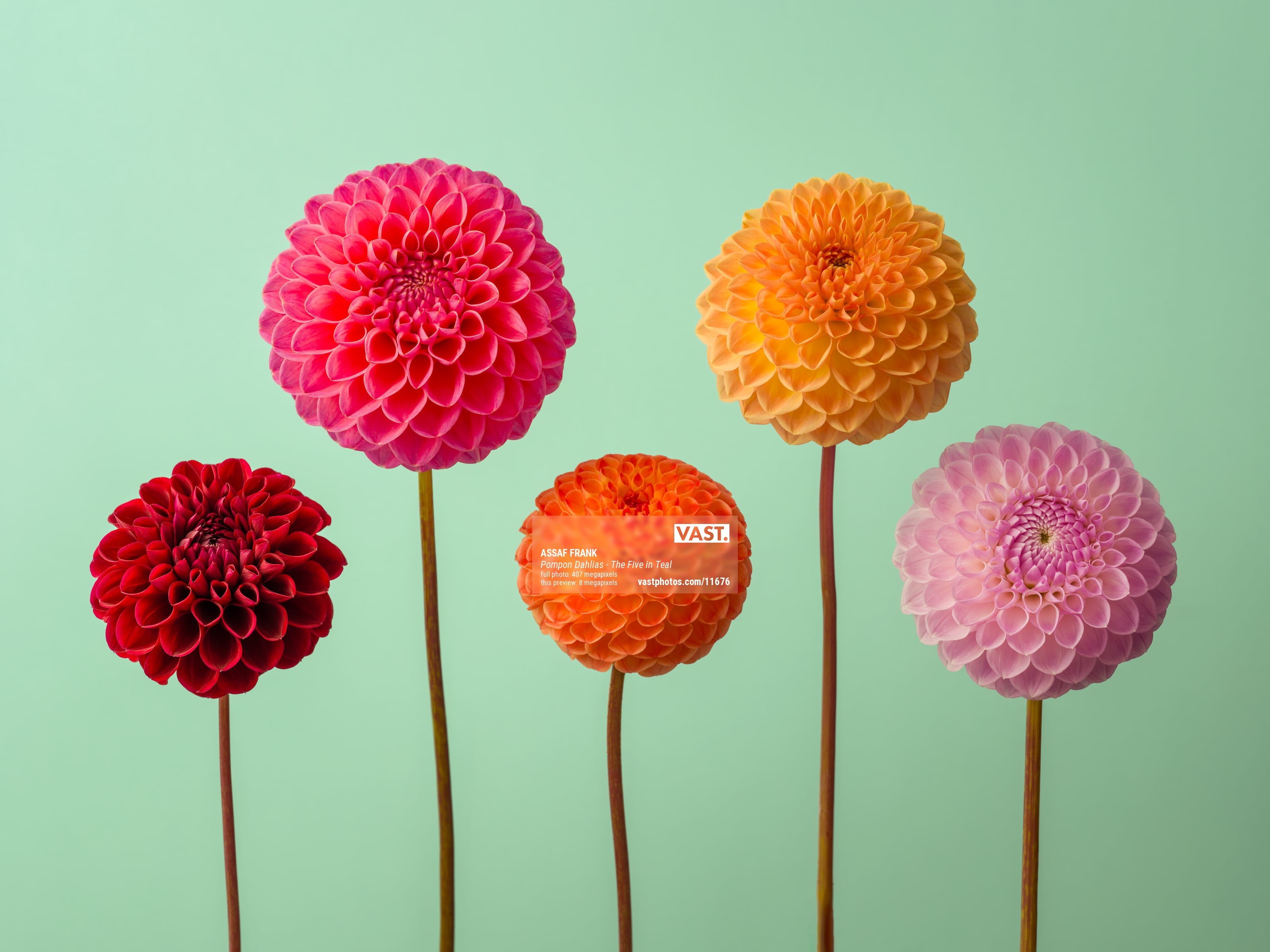 In a composition of thoughtful symmetry, five pompon dahlias are meticulously arranged against a bright backdrop — two above and three below. The soft lighting bathes the dahlias in a gentle glow, accentuating their flawless petals and intricate patterns. While similar in structure, each bloom exhibits subtle variances, showcasing nature's signature of individuality.