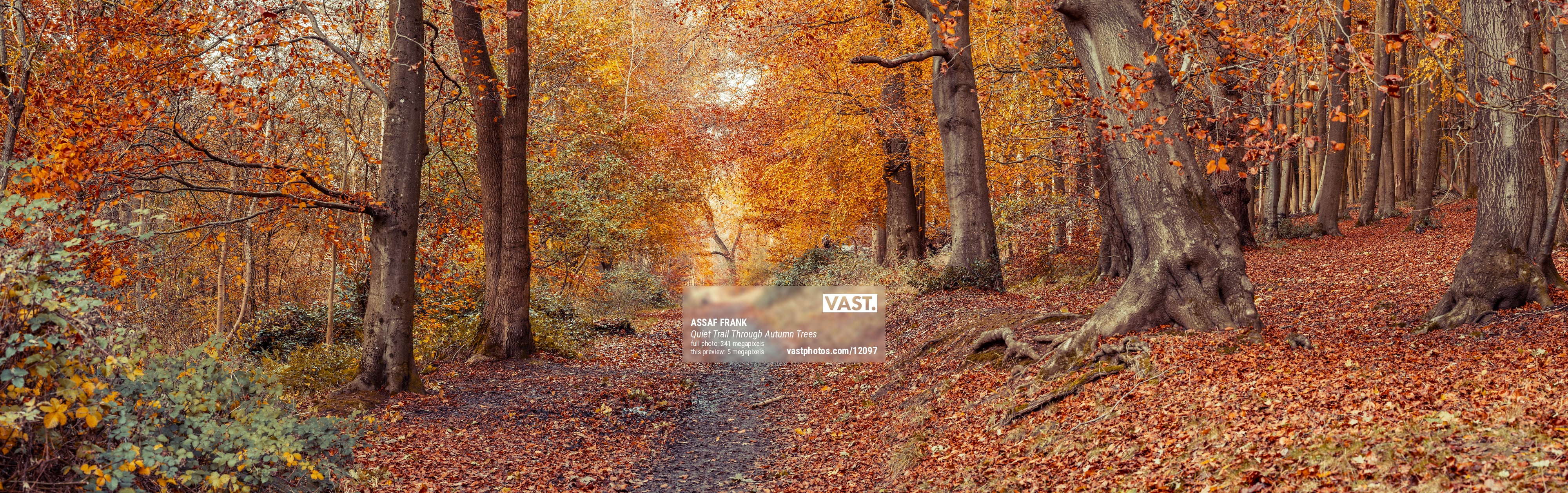 A peaceful woodland trail winds through a breathtaking autumn forest, surrounded by towering trees adorned in warm hues of orange, gold, and deep red. The soft path, lined with fallen leaves, meanders gently into the distance, inviting quiet exploration. The ancient trunks, with their textured bark and gnarled roots, add a sense of history and timelessness to the landscape. A delicate light filters through the canopy, casting a golden glow over the forest floor, creating an atmosphere of tranquility and reflection. The gentle curve of the trail disappears into the distance, evoking a sense of mystery and wonder.
