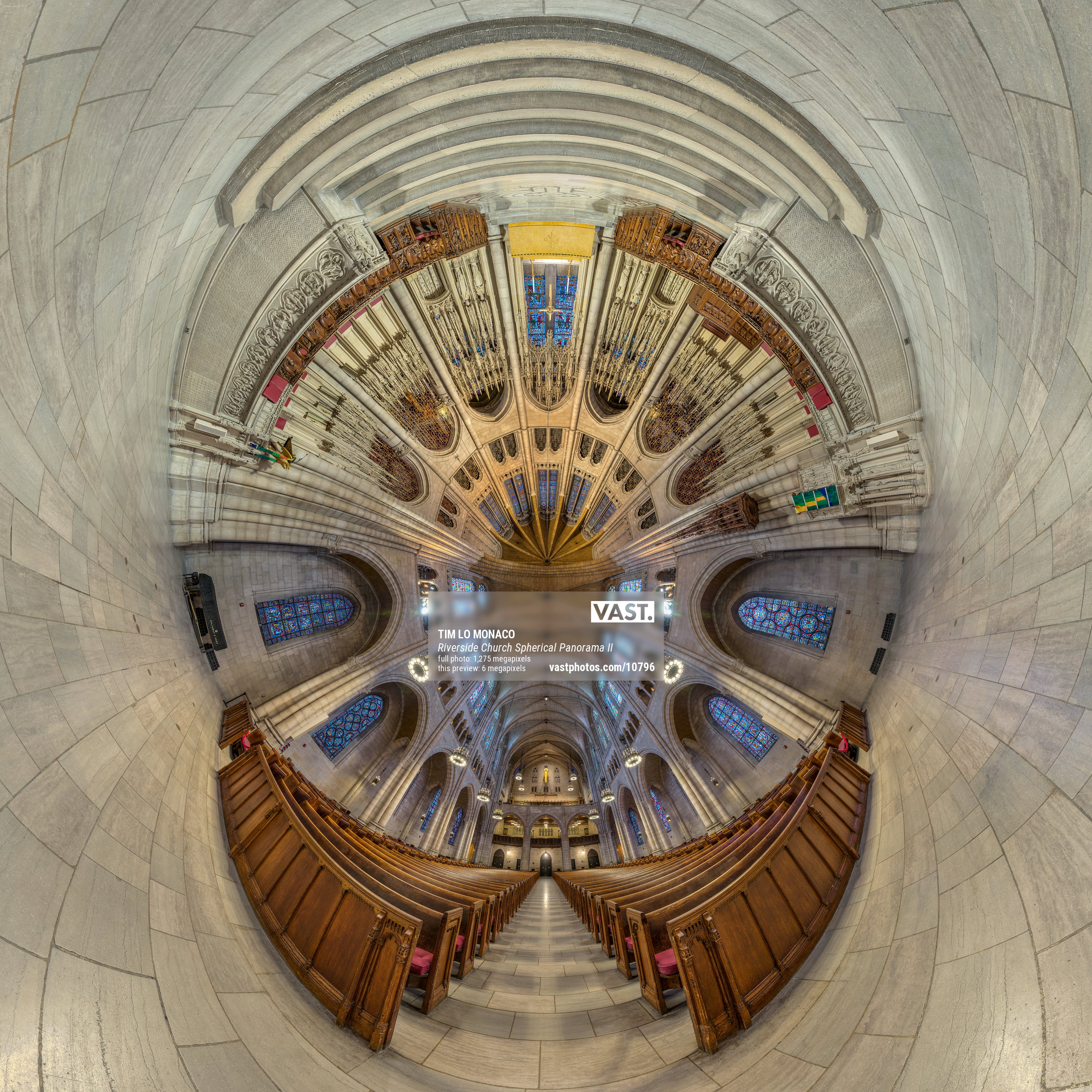 To create a spherical panorama or “little planet”, imagine taking photos of every angle as viewed from where you stand, including the points directly under your feet and straight above you. Combine all those photos into a single image and the end-result would be the view from inside a three-dimensional sphere. Flatten that into two-dimensions and you have what you see here. I chose the vaulted ceiling directly above me as the center point.