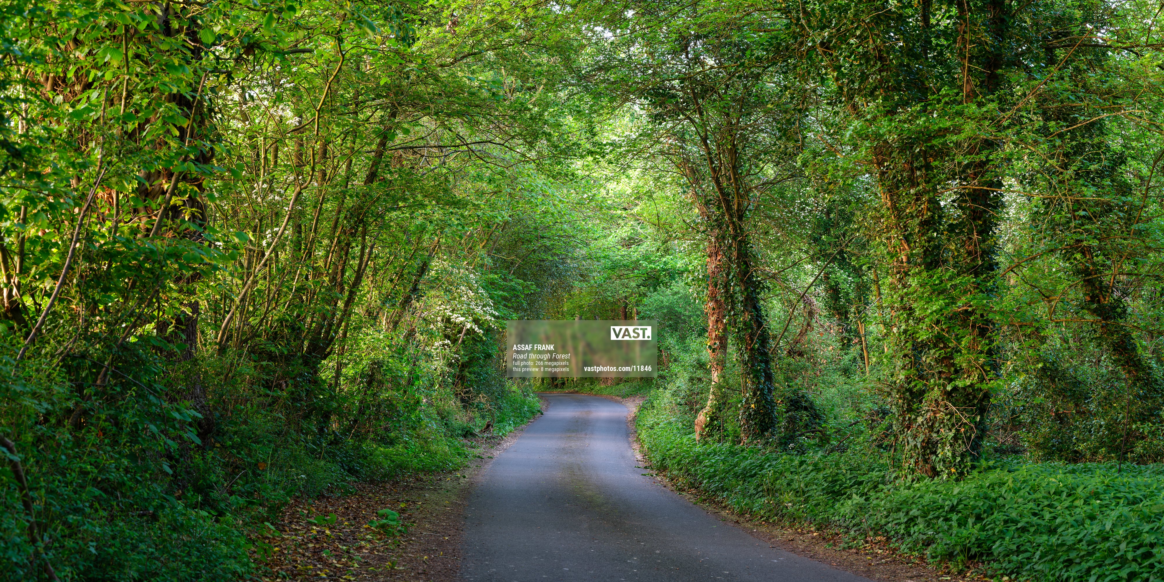 This serene photograph captures a quiet road meandering through a lush forest in Hertfordshire, UK. The dense canopy of trees forms a natural tunnel, allowing dappled sunlight to filter through the leaves and create a play of light and shadow on the path. The verdant foliage, with its rich shades of green, adds to the sense of tranquillity and seclusion.