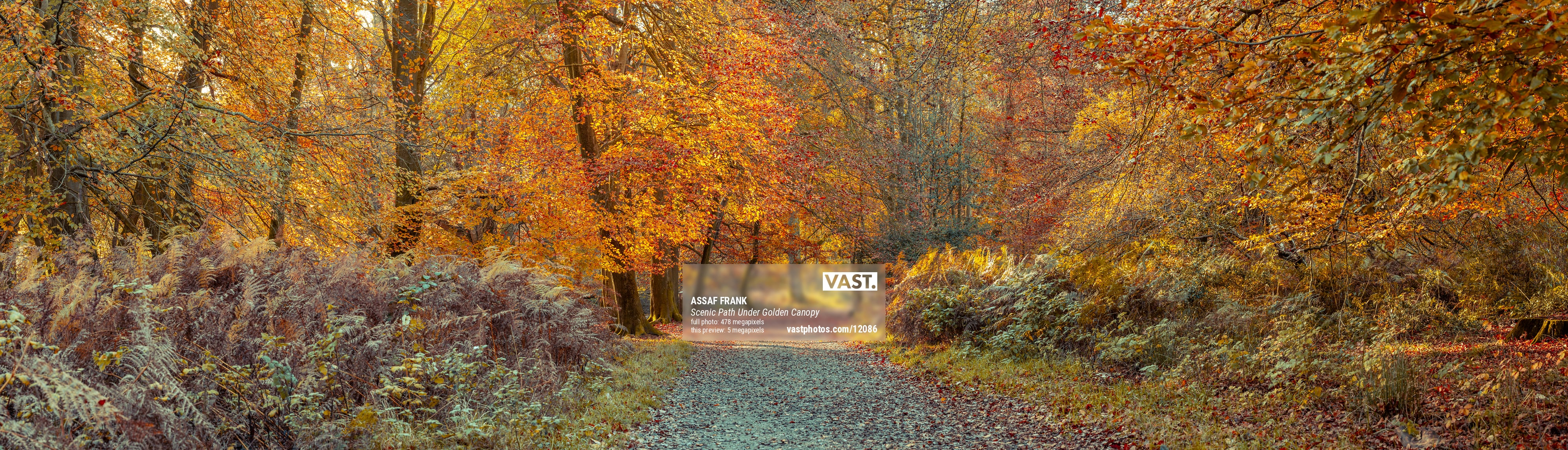 A scenic pathway winds through a stunning autumn forest, bathed in the golden hues of fall. The trees are ablaze with brilliant shades of yellow, orange, and red, their leaves forming a rich canopy that filters the warm sunlight. The forest floor is blanketed with crisp fallen leaves, creating a soft, natural carpet that enhances the rustic charm of the scene. As the pathway meanders deeper into the woods, it invites a peaceful journey through nature’s seasonal masterpiece.